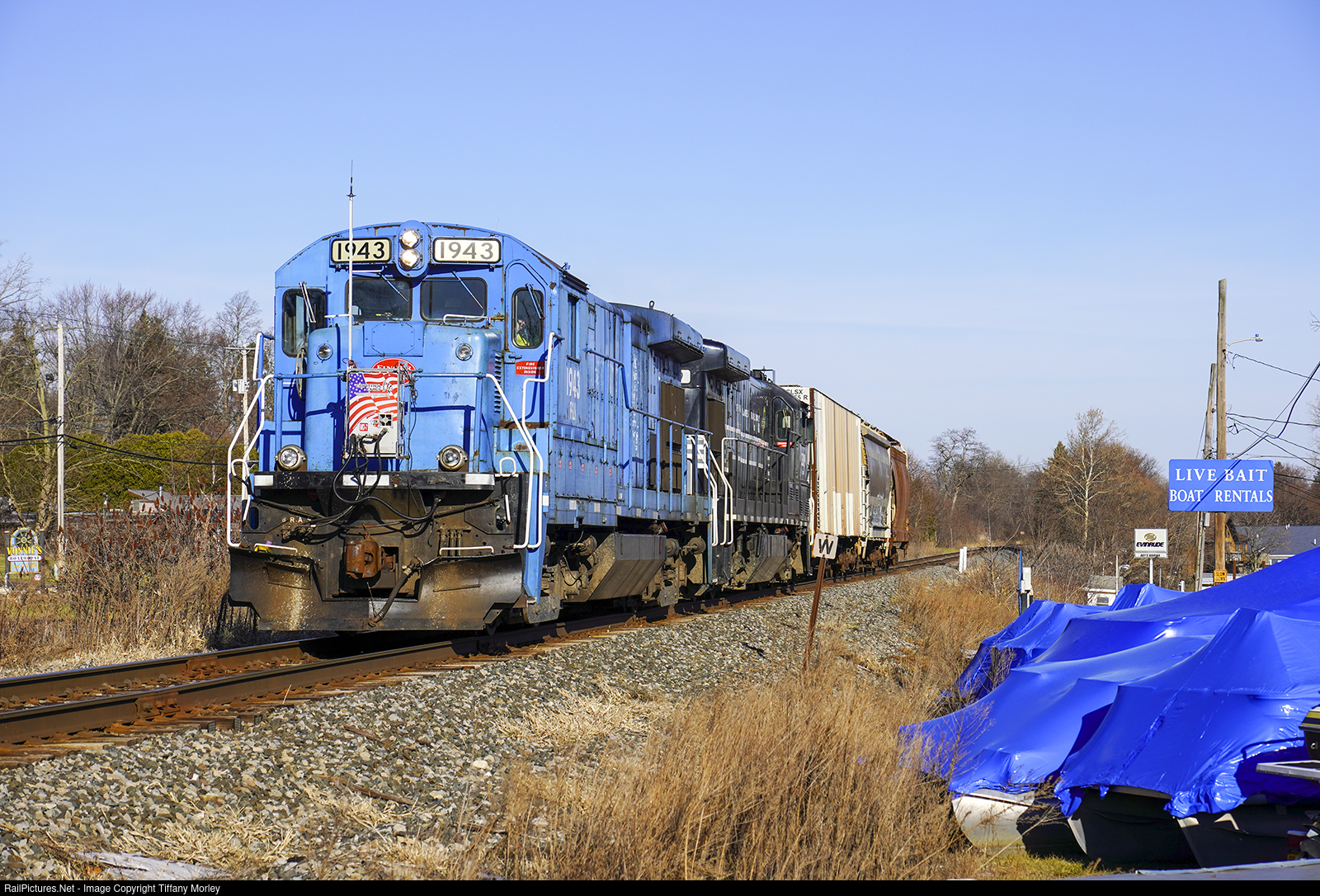 The Finger Lakes Railway's Himrod to Geneva turn heads South for the Himrod Yard with a small train and passes Roy's Marina on Seneca Lake.