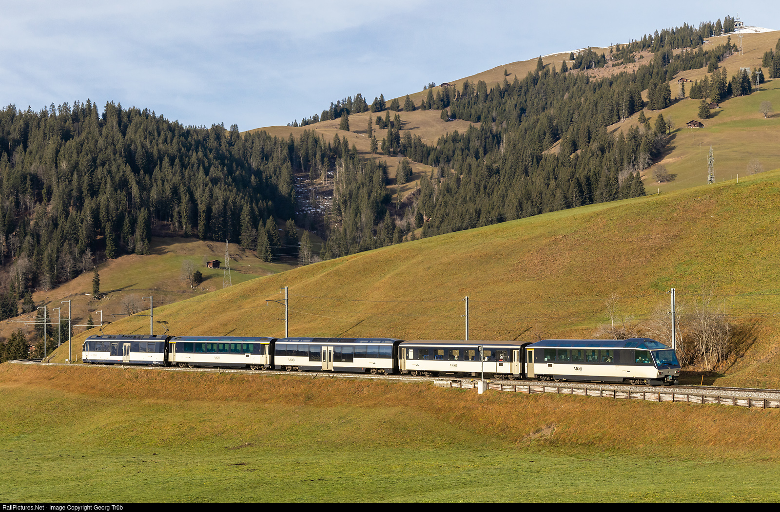 | Push-pull GOLDENPASS PANORAMIC train PE 2212 of the Montreux-Oberland-Bernois (MOB) from Montreux to Zweisimmen, between Gruben and Schönried (photo from the rear). Pulling is ALPINA railcar Be 4/4 # 9203 (StadlerRail), followed by first class As # 112, partly lowfloor second class Bs # 237, second class B # 218 and first class cab car Ast # 117 in the rear. |