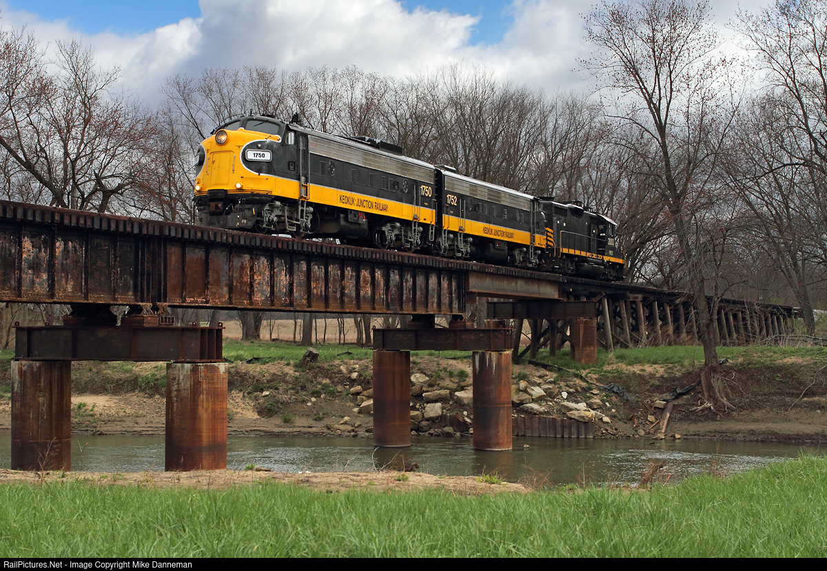 Keokuk Junction Railway EMD FP9 Nos. 1750 and 1752, and EMD GP20 No. 2003 cross the Spoon River at Seville, Illinois, on April 7, 2016. The locomotives are running light to Bushnell to switch the ADM plant located there.