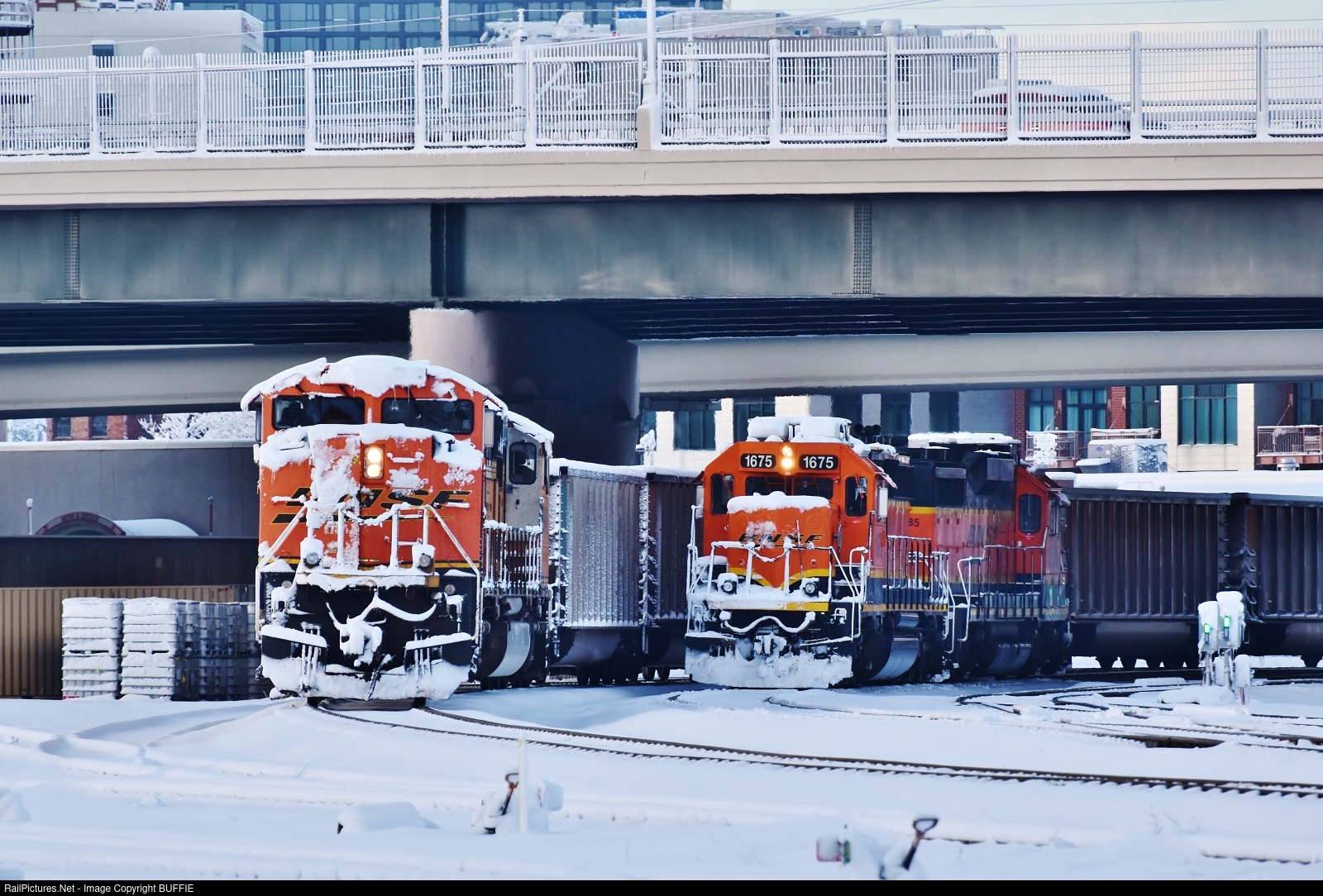 | A frosty BNSF 8460 (SD70ACe) leads an empty coal train under the Park Avenue Viaduct in Denver, Colorado as it heads to the downtown BNSF yard. |