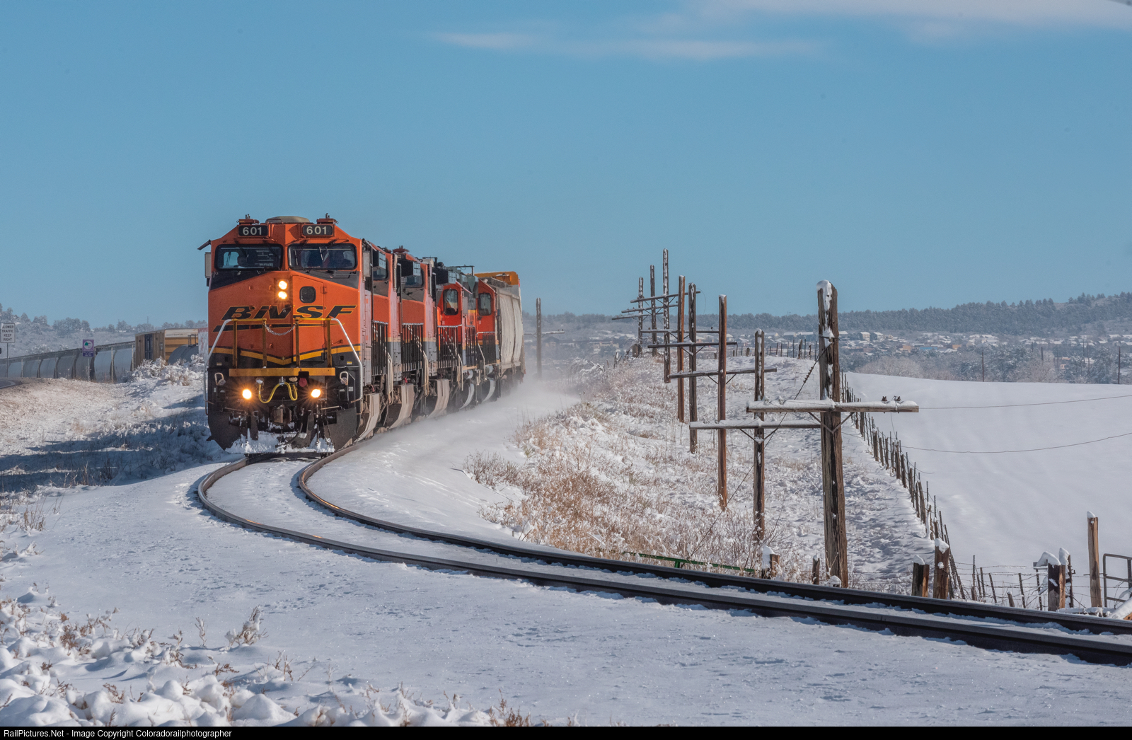 Heavy snow covered the Palmer Divide on December 28th and on the morning of December 29th. Still punctuated in line poles the zag south of Sedalia has delighted railfans for generations, ATSF steam to BNSF Tier 4, the poles tell a story. |