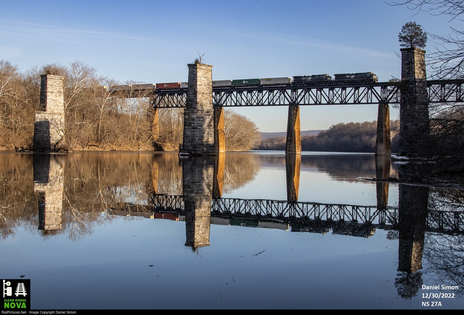 Norfolk Southern train 27A crosses the Potomac from Maryland into West Virginia southbound on the NS Hagerstown District.