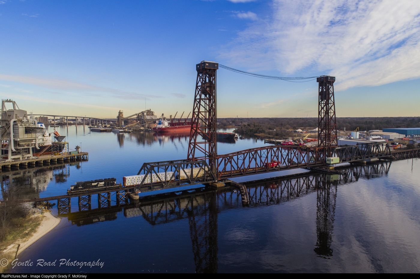 | NV03 crosses the former Virginian Railway drawbridge over the southern branch of the Elizabeth River in Chesapeake, VA. This line, which once saw FM's leading long coal drags for the VGN coal piers now sees a local 1-2 times a week. |