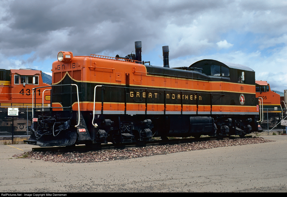 Great Northern EMD NW3 No. 181 makes a great display in the parking lot of the station at Whitefish, Montana, as seen on September 6, 1999. Only seven NW3 locomotives were built by EMD, all going to the GN. The units were built on lengthened frames and were equipped with Blomberg trucks, and had large cabs with a bulge just ahead of the cab containing a steam generator for passenger service. The orange and dark green paint on the BNSF locomotives in the background sure is similar.