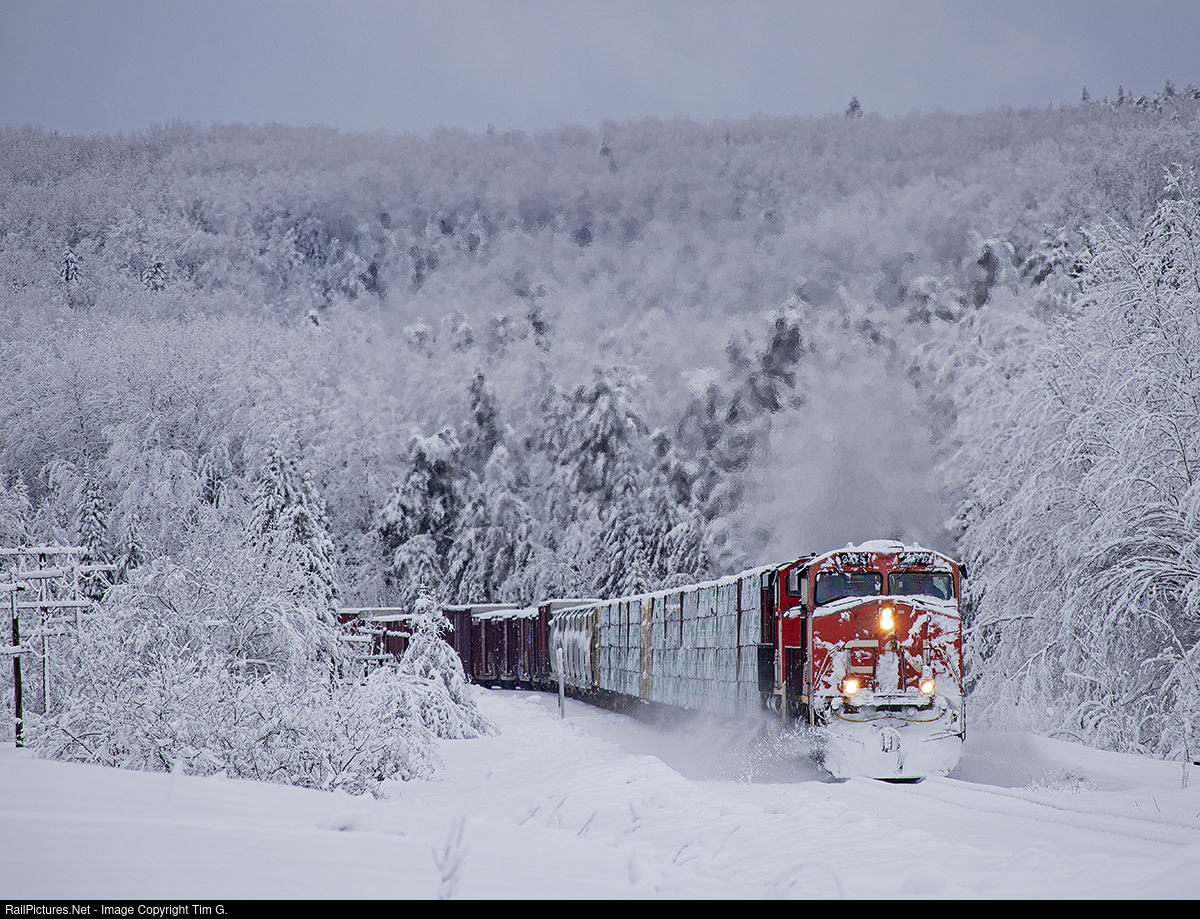 Surrounded by a gorgeous fresh snowfall, manifest/grain empties 841 makes a run at Mabella Hill; the ruling westbound grade on the Kashabowie Subdivision.