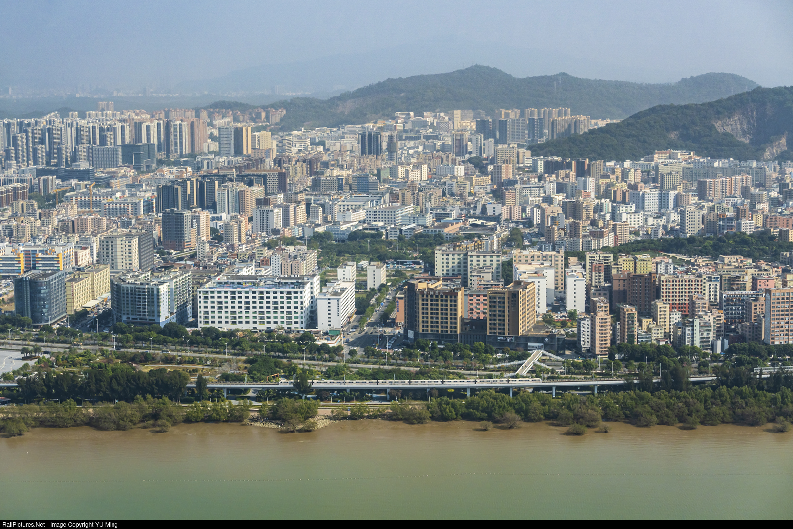 A train of Shenzhen Metro Line 11 is traveling between the Pearl River and the city's Bao'an District.