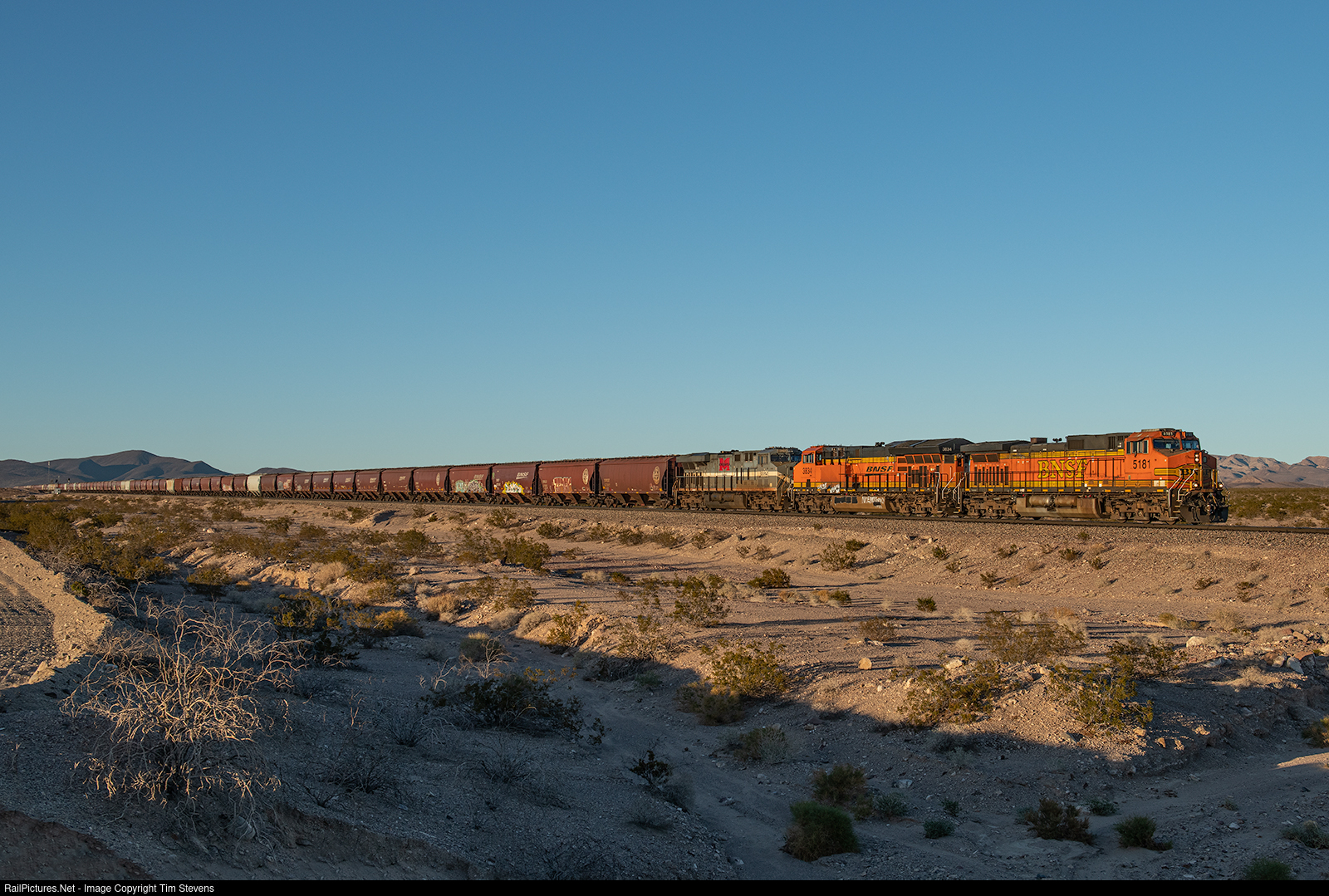 120 grain empties are eastbound on the Needles Sub approaching West Siberia behind BNSF 5181, BNSF 3834 and NS (MGA heritage) 8025.