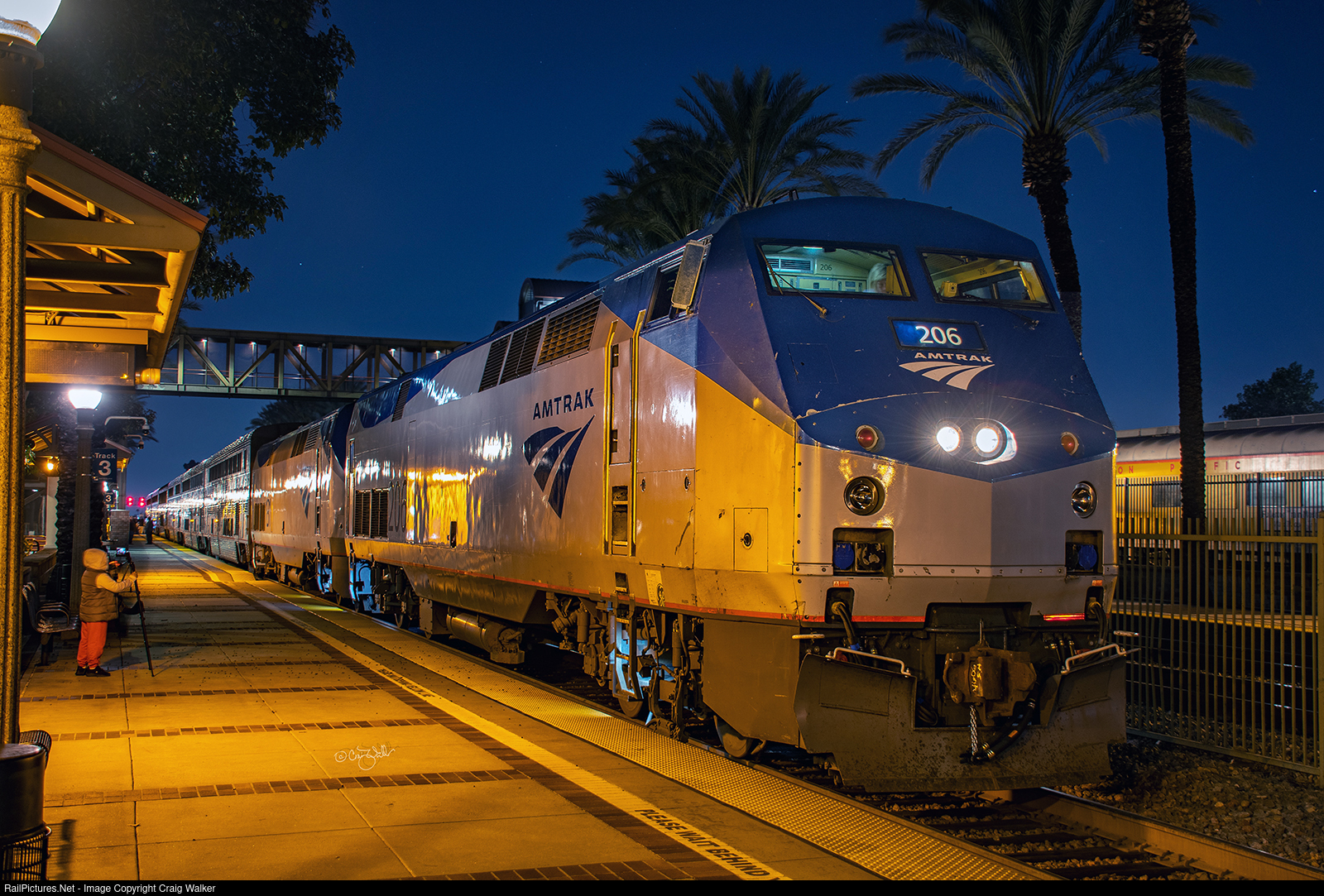 The first Amtrak train 4 of the new year makes the first stop of its journey. Just a few miles out of Los Angeles, Amtrak P42DCs 206 and 131 are pulling six cars (39038, 23086, 38048, 33009, 34109 and 31018). This Southwest Chief will continue its journey within minutes and roll into Chicago on January 3. (Fullerton, California – January 1, 2023)