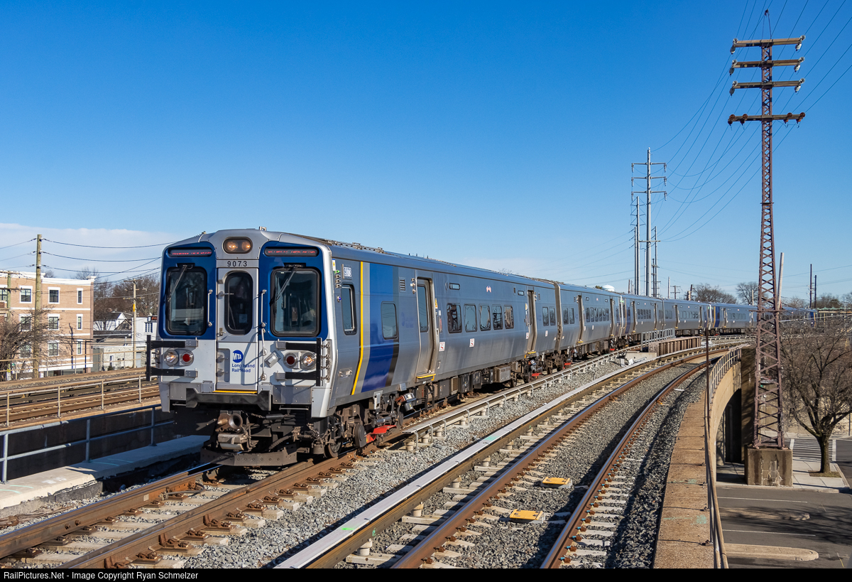 | A six-car set of the LIRR's new M9s makes its way off of the Hempstead Branch onto the Main Line at Floral Park. Visible under the lead unit is the switch leading to the beginning of the new third track added to the Main Line between Floral Park and Hicksville. |