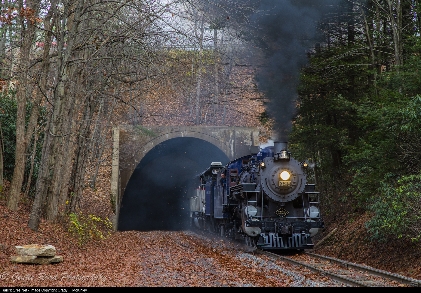 RBMN #425 blasts out of the tunnel under route 93 at Nesquehoning, PA with the return excursion from Jim Thorpe to North Reading.