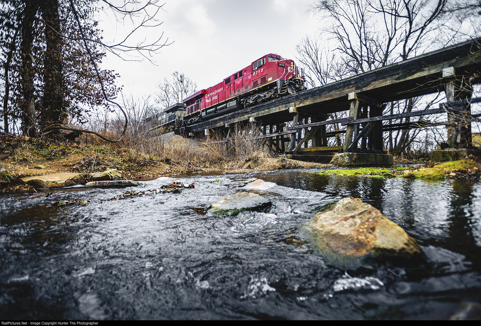 | Clouds have set in over Siloam Springs, AR as a Canadian Pacific locomotive leads a southbound train across the trestle over Sager Creek just before clearing the signal at Control Point North Siloam on the warm afternoon of Monday, January 2, 2023. What started out as a fairly sunny morning turned to clouds in the early afternoon before rain moved through the area. |