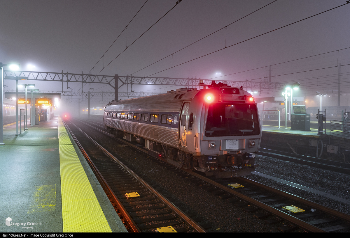 On the morning of April 1st, 2022, the Federal Railroad Administration's former Metroliner DOTX 216 inspection railcar sits alone in thick fog on track 6 at New Haven Union Station in Connecticut.