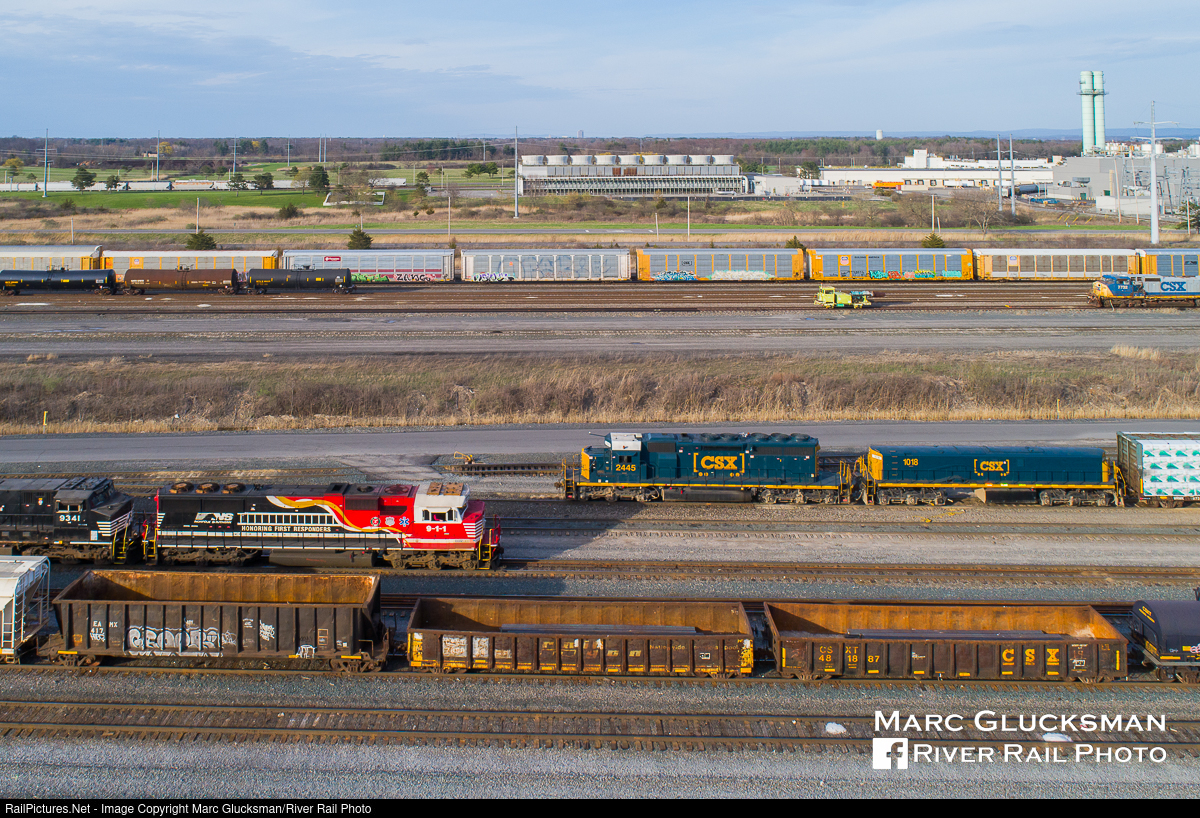 A Scene In Selkirk. On May 2, 2018, Norfolk Southern Corp 911 (Honoring First Responders, SD60E) led CSX Train Q364-01, seen arriving at its terminal at the receiving yard in Selkirk, New York. The NS unit is about to pass the unique slug set of CSX 2445 (ex-SBD 8195, née-LN 3567, EMD, SD40-2, 10/1974) and MT-6 CSXT 1018 (ex-CR 1128, exx-PC 8613, née-8613, RSD12, Alco, 8/55). CSXT 1018 was involved in an accident in 2022, and remains out of service. CSXT 7732 (C40-8W) in YN2 paint in the midground was the model for a Bachmann Spectrum Model, but has since been sold to LTEX. Far in the background is the genset switcher that works the Selkirk CoGen Plant.