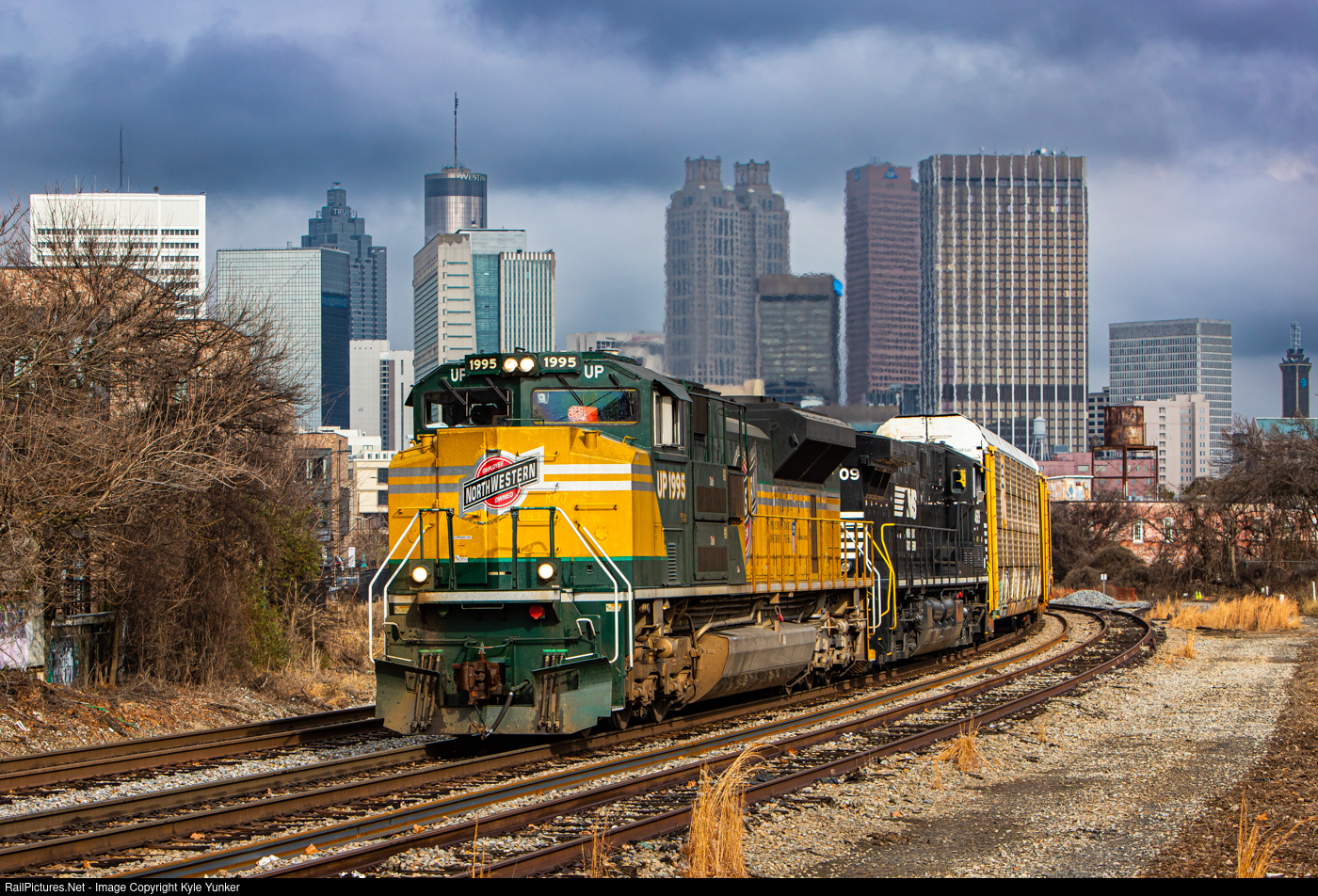 | UP's Chicago & Northwestern heritage SD70ACe leads Norfolk Southern transfer job G70 out of downtown Atlanta,GA moments after a thunderstorm had come through. |
