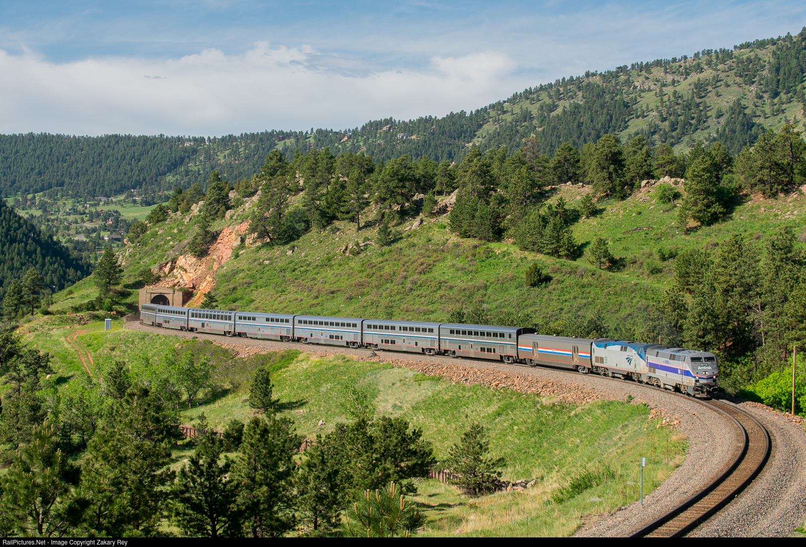 | Amtrak's westbound California Zephyr (train no. 5) has just exited the first of 29 different tunnels on the Eastern side of the Divide and approaches Plainview, CO on their way west |