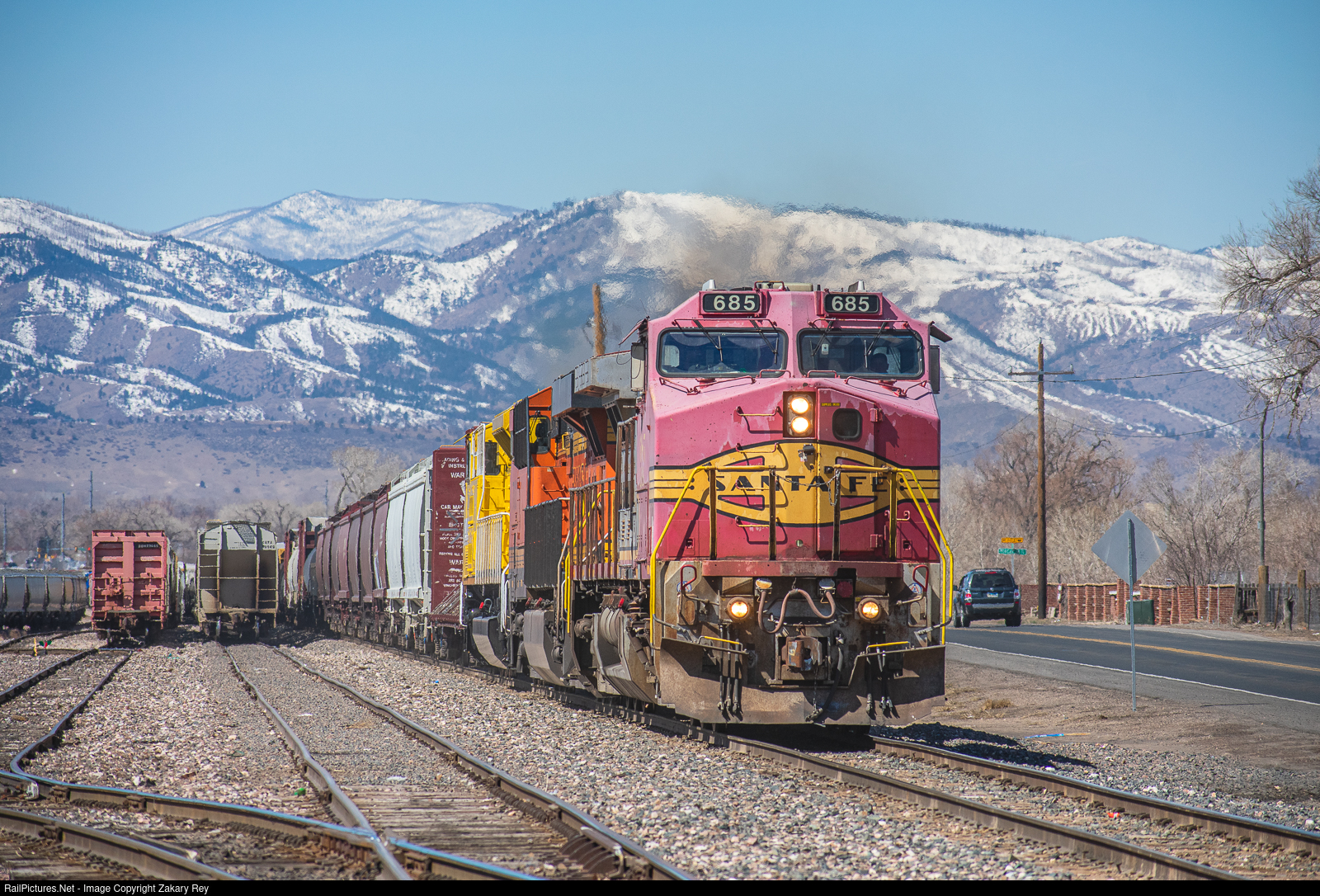 A former workhorse of the Santa Fe, BNSF C44-9W #685 still gets her work in almost 30 years after entering service, seen here on point of BNSF's high priority manifest from Denver, CO to Laurel, MT passing through North Yard in Fort Collins, CO
