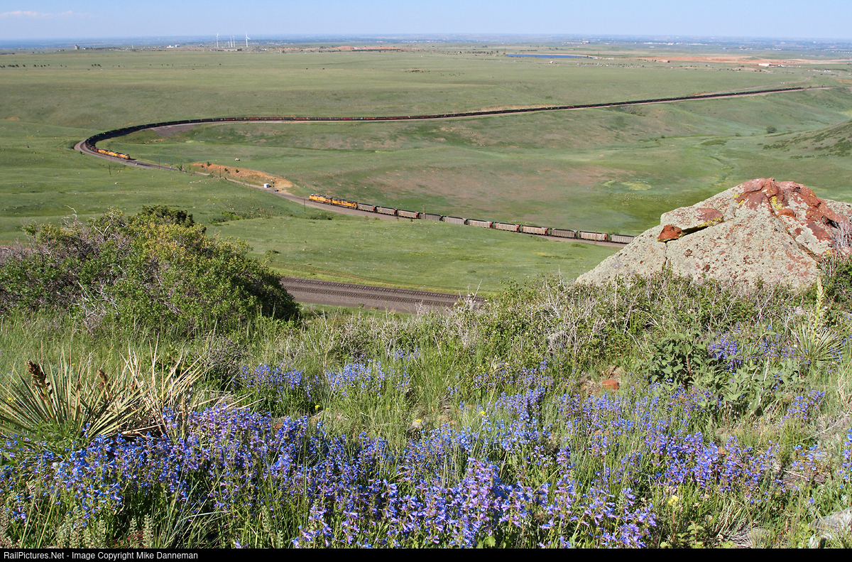 On June 9, 2013, ample springtime rainfall has brought out wildflowers among green grasses on Colorado’s front range mountains, as an eastbound Union Pacific coal load slowly drops downgrade and is about to meet a westbound UP coal empty in the siding at Rocky. Just moments before, the eastbound coal train was passing through Eisele (Clay) trackage seen in the foreground.