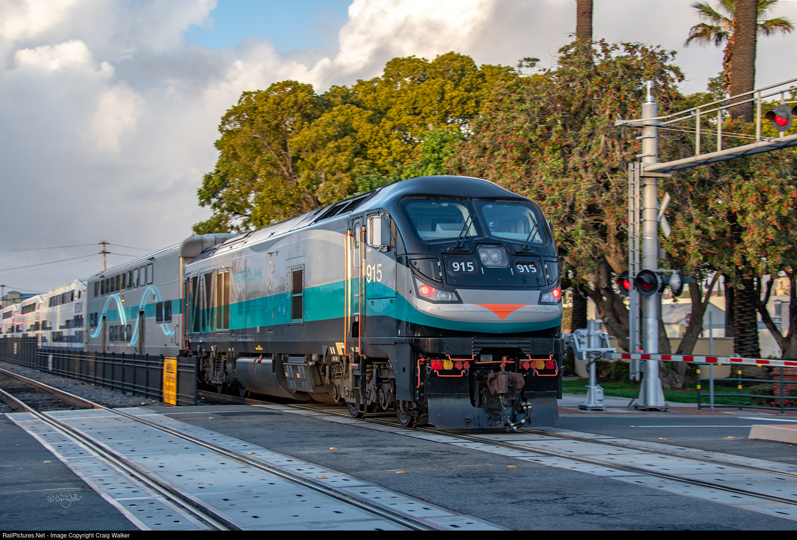 The day started off with 2½-inches of rain, but by 16:30 (4:30 pm) the precipitation had ceased long enough ago that the sun had come out by the time Metrolink train 609 rolled past Depot Park and stopped at the former Santa Fe Station in the city of Orange. This train, bound for Los Angeles, originated in Laguna Niguel/Mission Viejo rather than Oceanside due to unstable earth along the beach in San Clemente, and the stabilization effort will not be completed until February. (Orange, California – January 5, 2023)