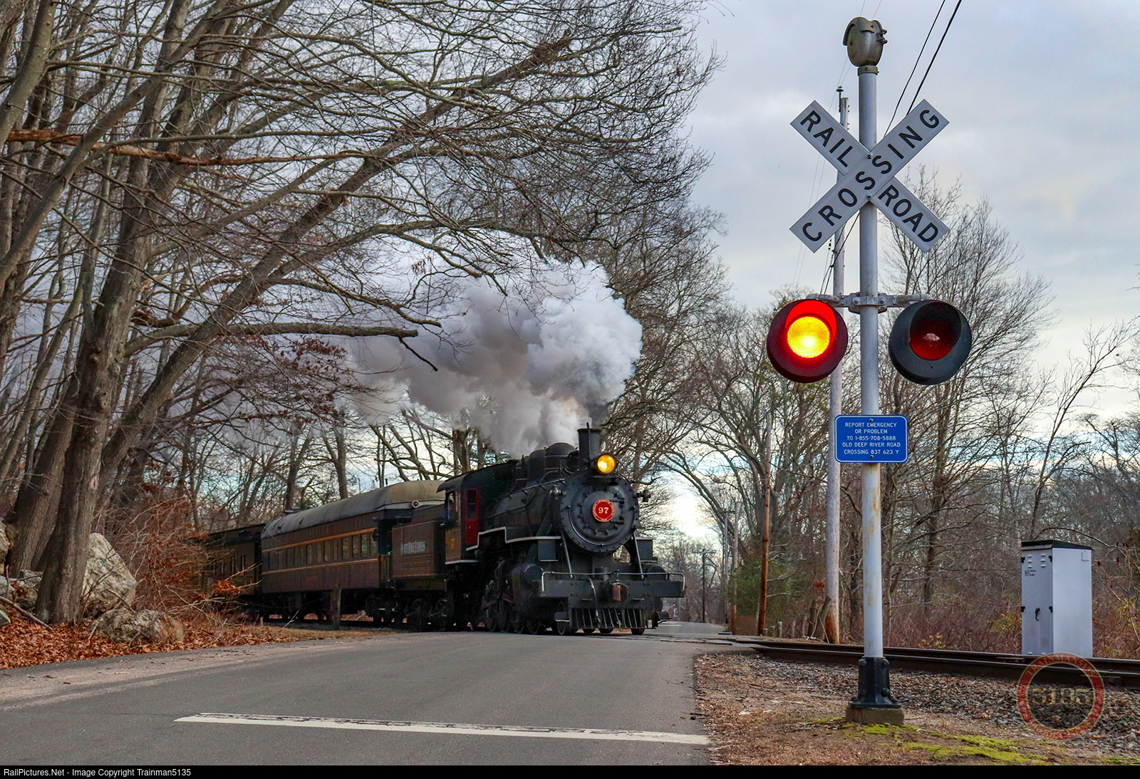 Venerable Valley Railroad #97 has the honors on the first North Pole Express as it rumbles through Old Deep River Road