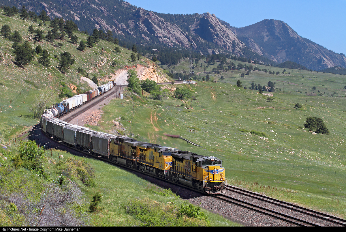 Union Pacific MRONY, a Roper Yard in Salt Lake City to North Yard in Denver manifest freight, rolls through Eisele (formerly Clay), Colorado on June 2, 2013. In the background are the Flat Iron rock formations that loom above the southwest side of Boulder.
