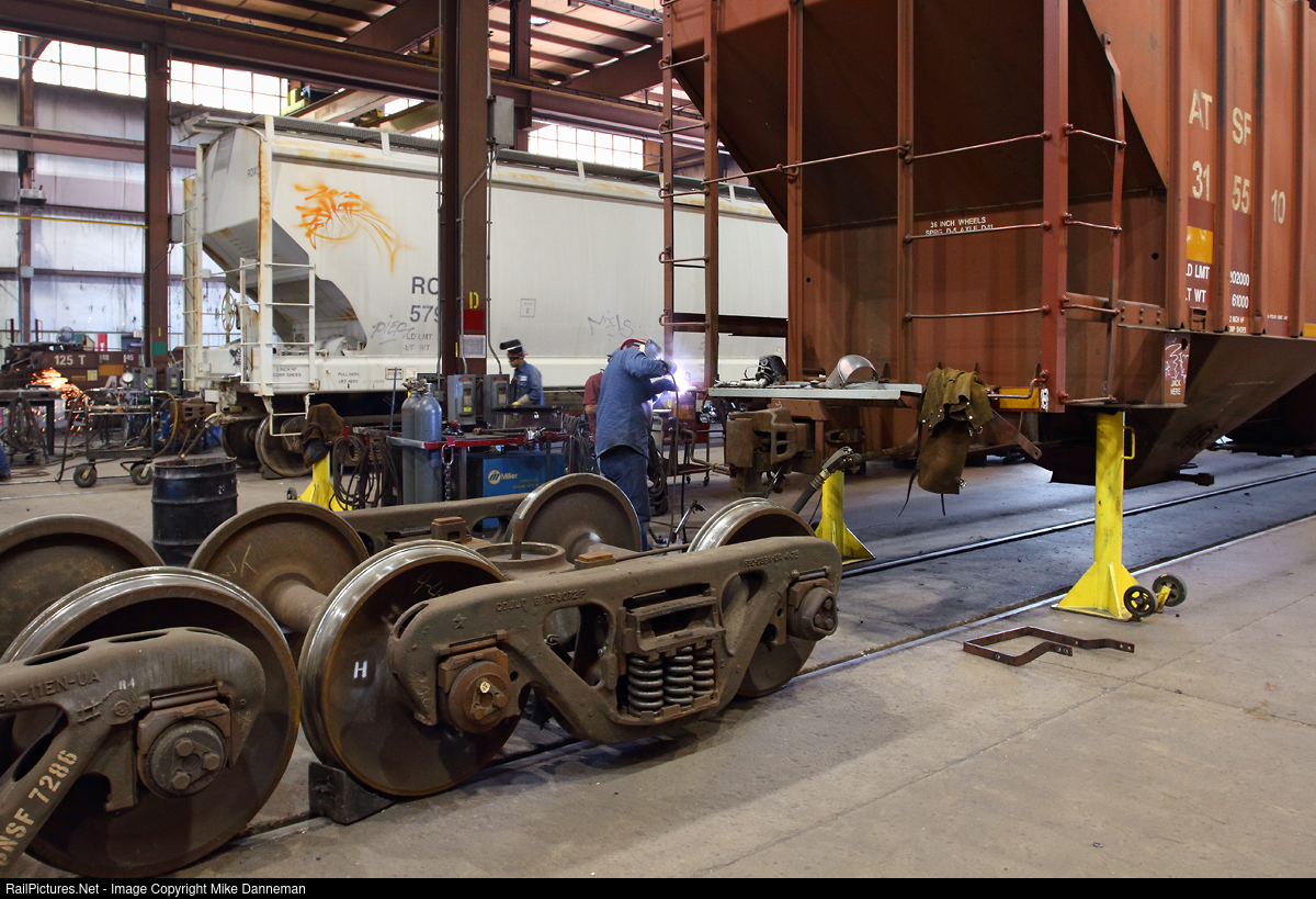 | Repairs are being made to Santa Fe covered hopper No. 315510 in the busy Progress Rail Services car shop at Amarillo, Texas, on June 15, 2012. |