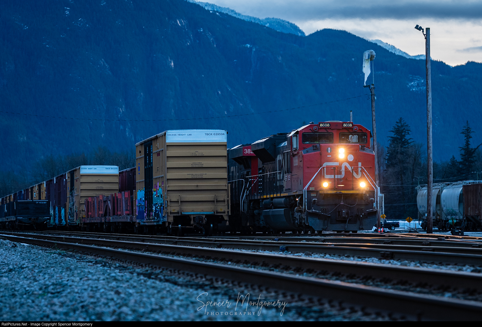 | CN 8888 sets out their 54 cars in the old BCRail Squamish yard, after doing an unexpected New Years Day run. This train had 53 loads for the docks in Squamish, plus another 12 loads where in the yard making 65 total loads that needed to be spotted into the dock. |