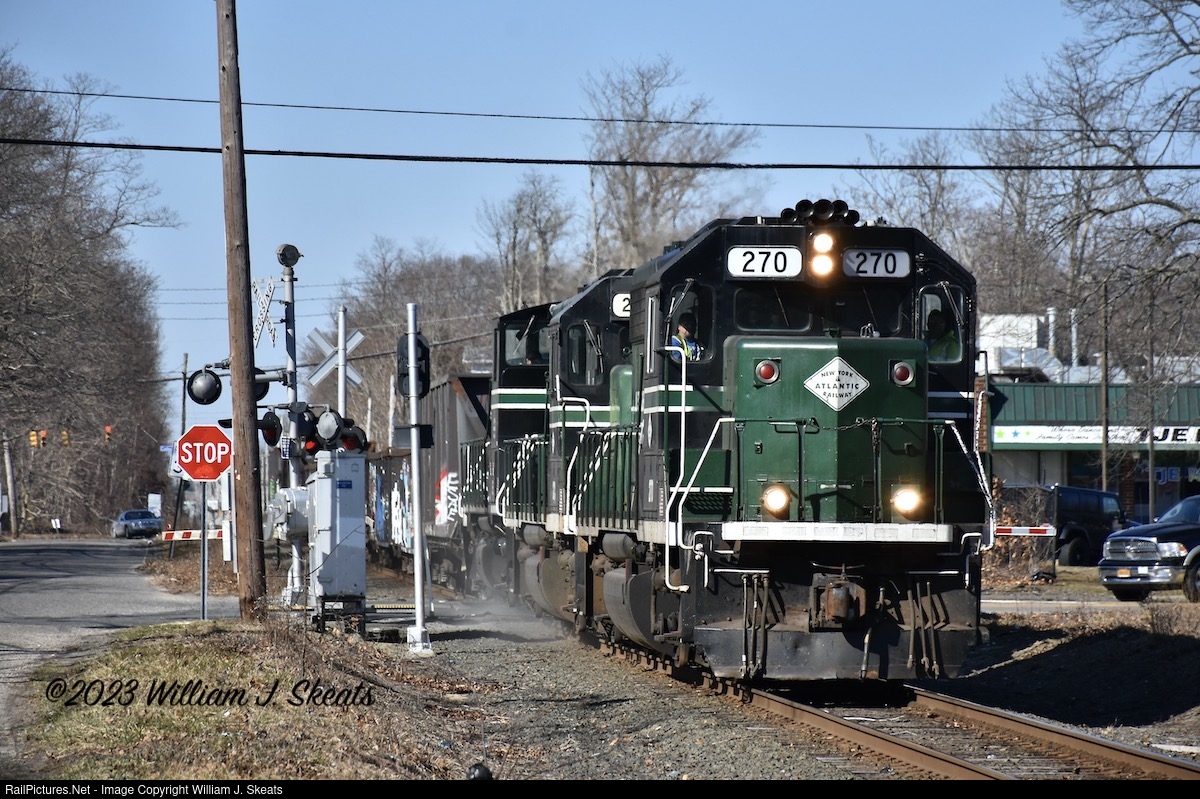 | RS 70 heading through the Main Street RR crossing along Railroad Avenue in Holbrook. GP38-2 270, 271 and MP15AC 155 and 12 cars for Gershow Recycling. Passing (DSI) Distant switch indicator for Posillico Materials East to the east. |