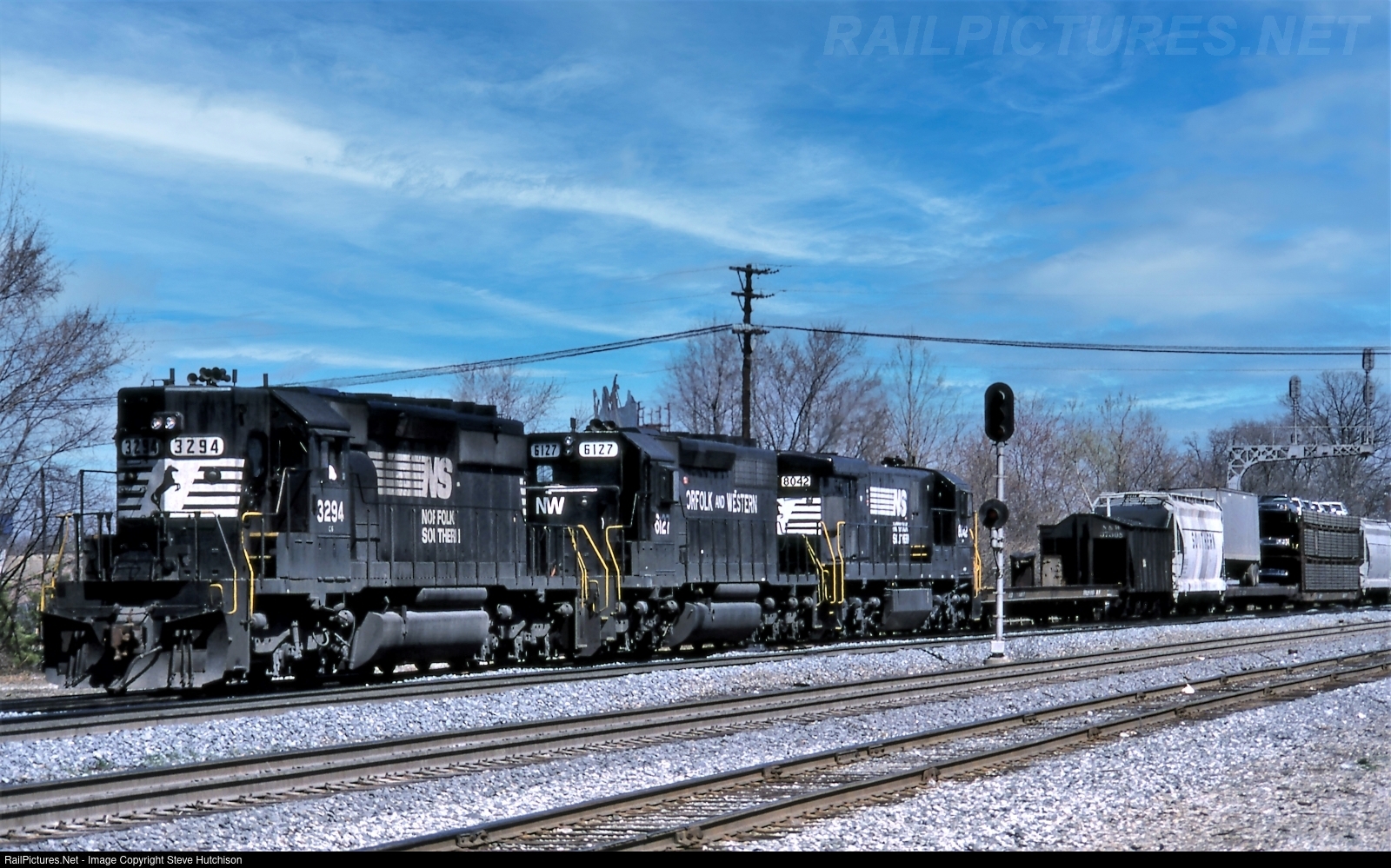 | Former Southern Ry SD40-2 3294, leads a southbound mixed freight leaving Pomona Yard. The second unit is Norfolk & Western SD40-2 6127 and the third unit is former Norfolk & Western C30-7 8042. |