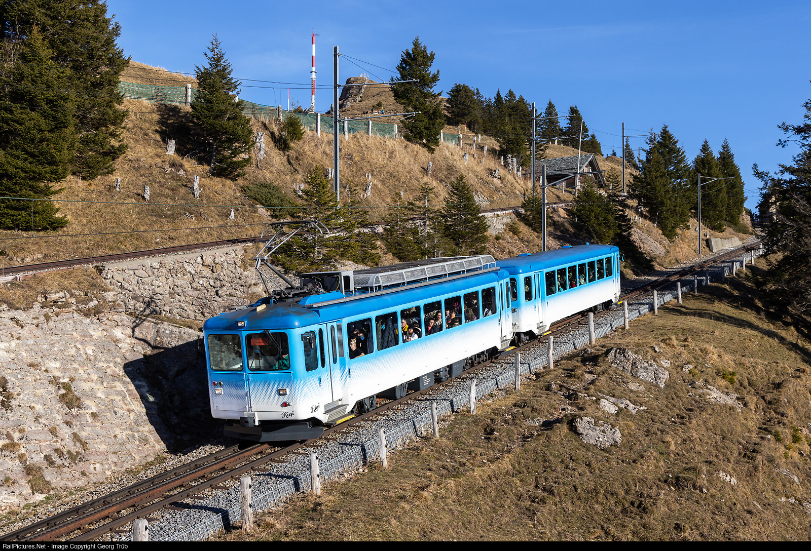 | Cogwheel railcar BDhe 2/4 # 11 with cab car Bt # 21 of the Rigi Bahnen (former Arth-Rigi-Bahn ARB) is running down between Rigi Kulm and Rigi Staffel with train 164 to Arth Goldau. The railcar # 11 was delivered in 1949, the cab car # 22 in 1958. In 1992 this train was modernised and has the "Schneeflöckli" paint scheme since then. |