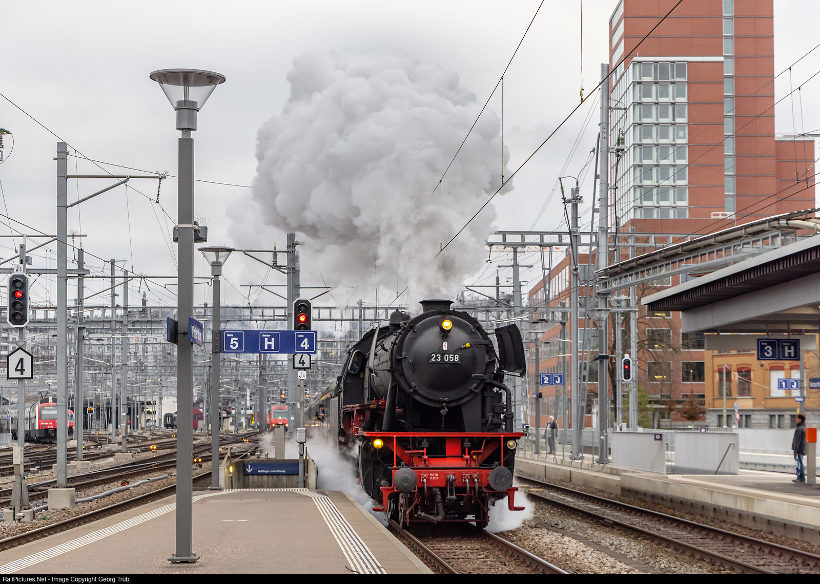 | 2-6-2 steamlocomotive 23 # 058 of the Eurovapor, built in 1955 by Krupp for the Deutsche Bundesbahn, is entering Winterthur with the "Winter Steam Special" from Romanshorn via Winterthur-Kloten-Regensdorf-Killwangen-Zürich Wiedikon-Ziegelbrücke-Sargans to Chur. The train had 8 cars of Eurovapor and DSF (Depot und Schienenfahrzeuge Koblenz) and in the rear was electrolocomotive Re 4/4 II # 11141 of the DSF (former SBB) for heating and traction help. The steamlocomotive ran from Romanshorn to Chur without taking water. |