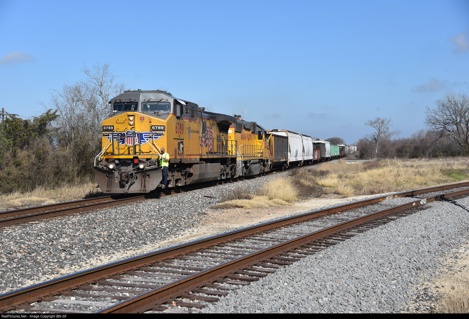 A UP local crosses the former MKT at West Point on its way to Flatonia. This diamond is a great morning train watching spot which features lots of traffic and two wyes to go between the former SP and MKT lines. Of note the second unit is a former MKT GP39-2.