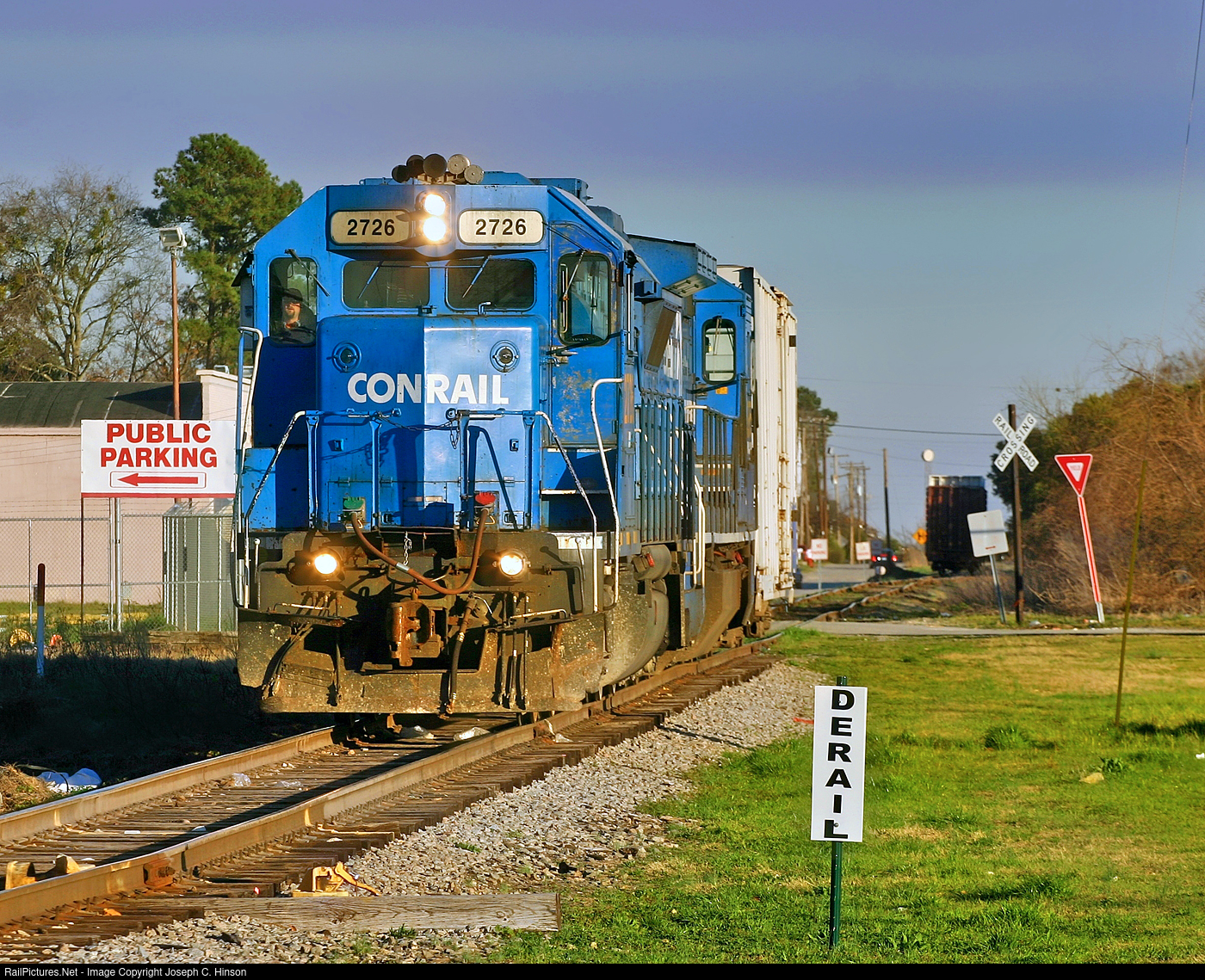 | A CSX crew is on the spur to a scrap juk yard in Columbia South Carolina in early 2007. CSXT 2726 was a GP38-2 built by EMD for Penn Central Railroad as PC 8068, to Conrail as CR 8068 and finally CSXT 2726. Some time after this photograph was made, it was rebuilt to CSXT GP40-3 2014. |