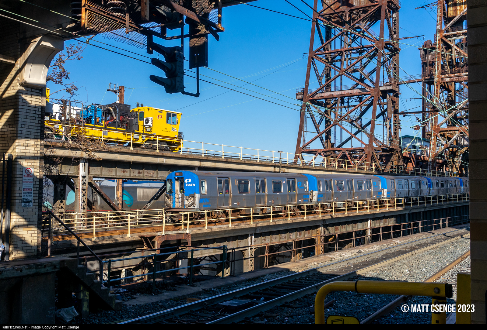 A Newark-bound Port Authority Trans-Hudson (PATH) train led by PA-5 no. 5800 (Kawasaki, 2008-2022) is seen arriving at Newark Penn Station on the lower level (Track M). Typically trains to Newark arrive on the upper level (Track H), but on this day that track was out of service for maintenance, with UTV 15 (Plasser American model PMC50) - one of PATH's elusive work locomotives - assisting with the work. |