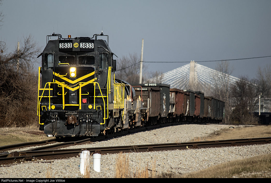 MG Rail GP7u 3833 remotely backs into one of the many industries in the Clark Maritine Center. The structure in the background is the Lewis & Clark bridge over the Ohio River to Louisville, Ky.