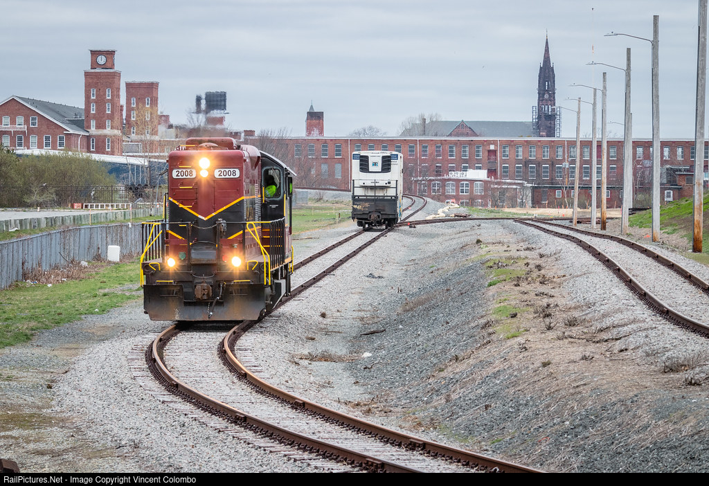 | Mass Coastal 2008 rolls toward Maritime Terminal Inc. in New Bedford to pick up an outbound car in the siding. The train will utilize the run-around on the right to later set out the inbound car seen behind the locomotive. |