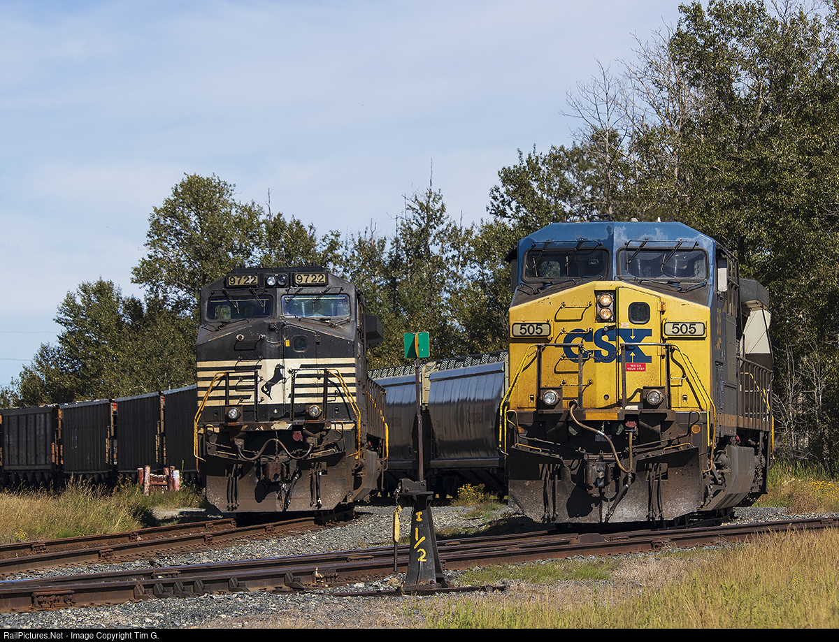 | Seen here at Thunder Bay Terminals on McKellar Island in Northwestern Ontario..... not that you'd know it. CN coke empties have been unloaded and await departure with visiting NS 9722 on point, and to the right CP potash loads arrive on the island with CSXT 505 on the tail end. |
