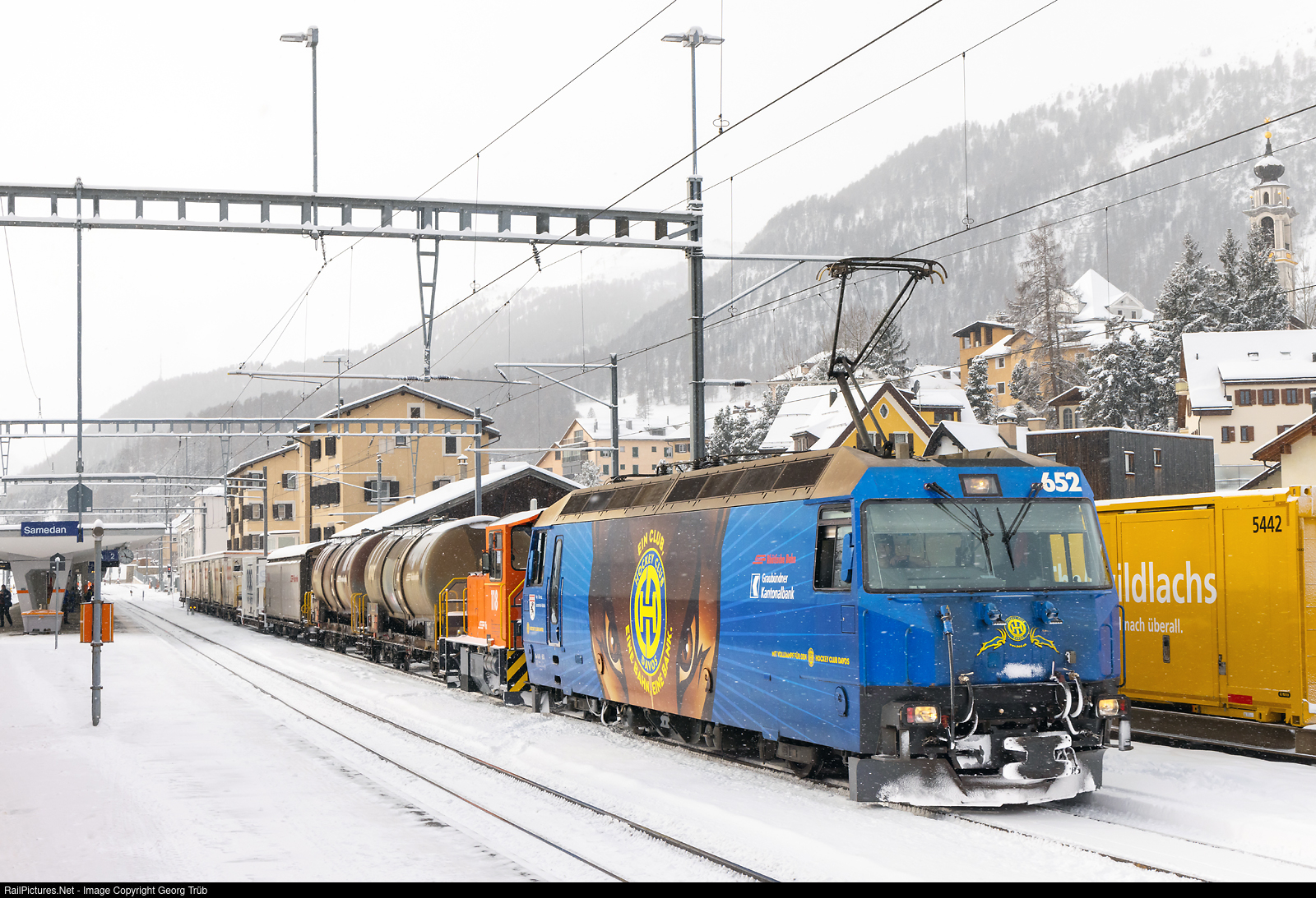 | Ge 4/4 III # 652 of the Rhaetian Railway in the publicity paint scheme for the Hockeyclub Davos (HCD) is ready for departure with the freight 5140 from Pontresina over the Albula line to Landquart, in Samedan. |