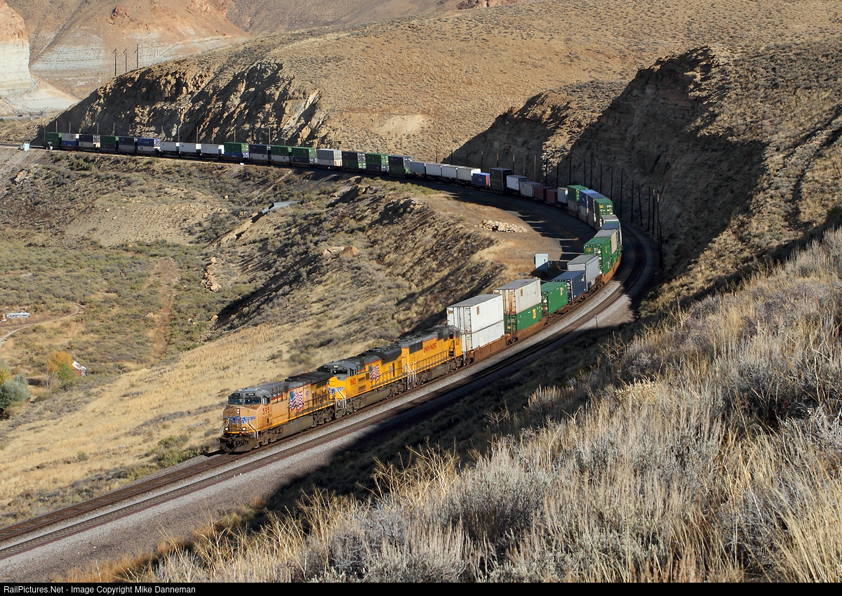 | Union Pacific GE AC4400CW-CTE No. 5951 leads a short UP stack train up Peru Hill west of Green River, Wyoming, on October 9, 2015.