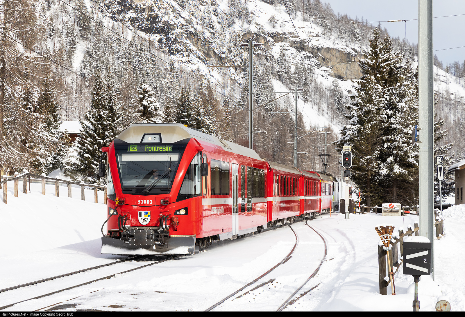 | Push-pull train of the Rhaetian Railway with leading cab car Bt # 52803 and locomotive Ge 4/4 II # 611 in the rear is entering La Punt Chamues-ch, running as regional train 1933 from Scuol-Tarasp via Zernez-Samedan to Pontresina. Typical for stations of the RhB in wintertime is the switch broom, which is in a device near the manually worked switch number 2. |
