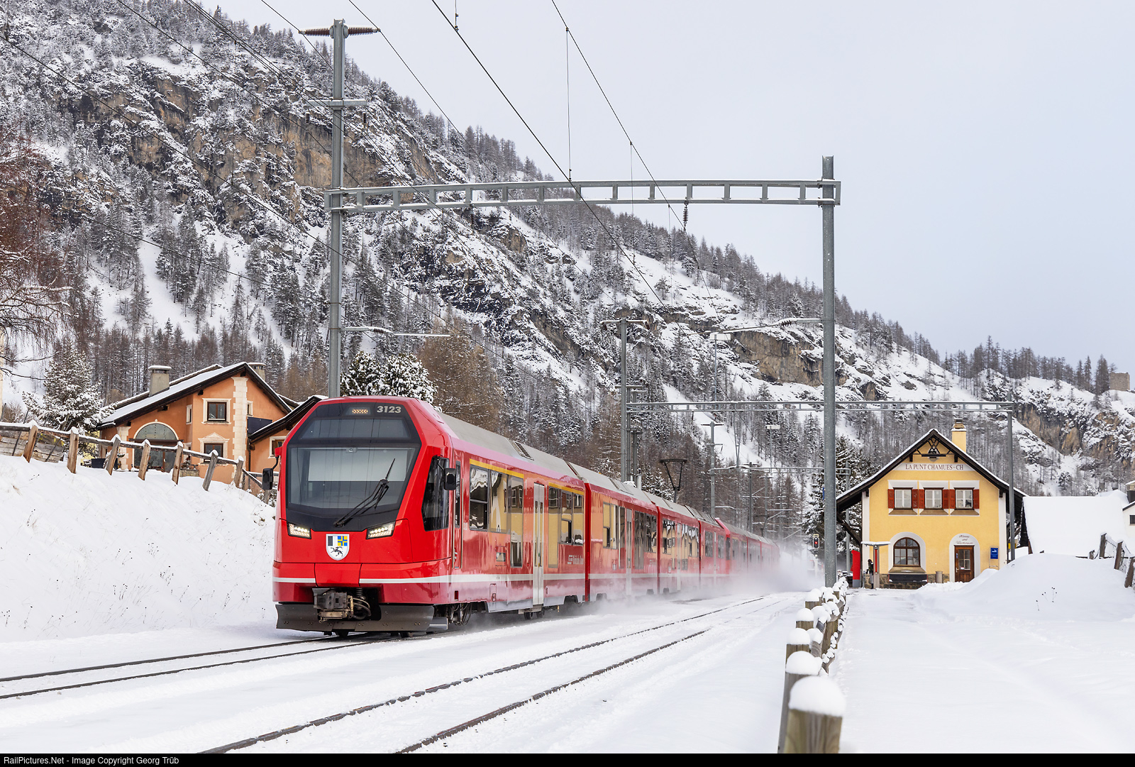 | The Regio Express RE 1031/1331 of the Rhaetian Railway from Landquart via Klosters-Zernez-Samedan to St.Moritz is running through La Punt Chamues-ch station without stop. "Capricorn" trains ABe 4/16 # 3123 and # 3131 in multiple control are doing the service. |