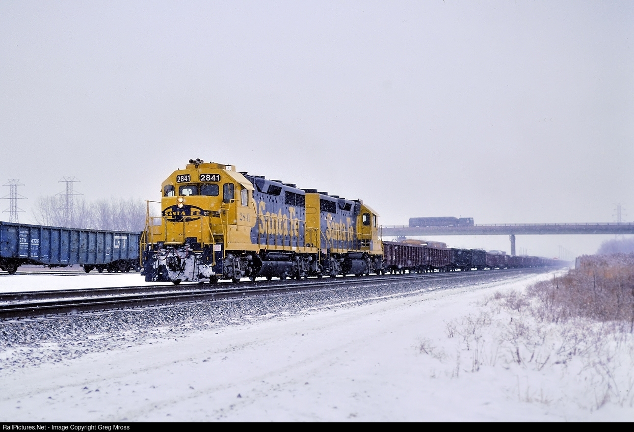 | ATSF 2841 rolls thru Burns Harbor, IN on a blustery Winter day in December of 1993. Foreign power was common on this segment of the Conrail mainline. |
