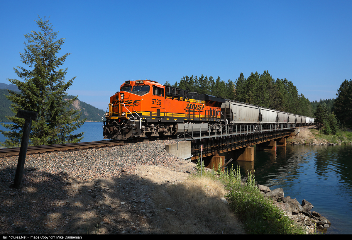 | On July 4, 2021, an eastbound BNSF grain empty crosses Bridge 62 over the inlet of Swamp Creek into the Clark Fork at Tuscor, Montana. |