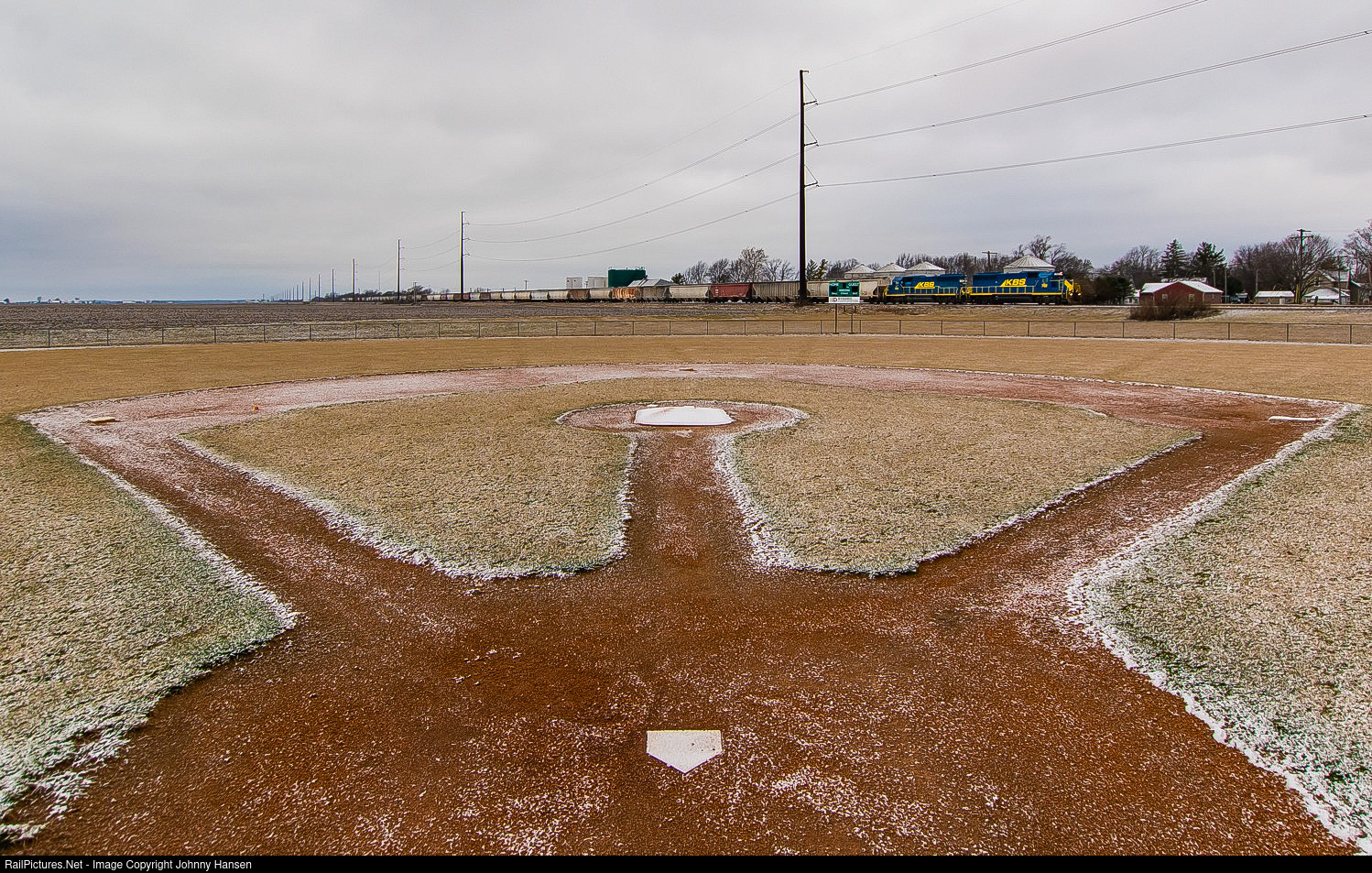 An eastbound Lafayette-bound grain train of 50 loads heads east into the small community of Otterbein, IN with two KBSR GP38-2’s at point.