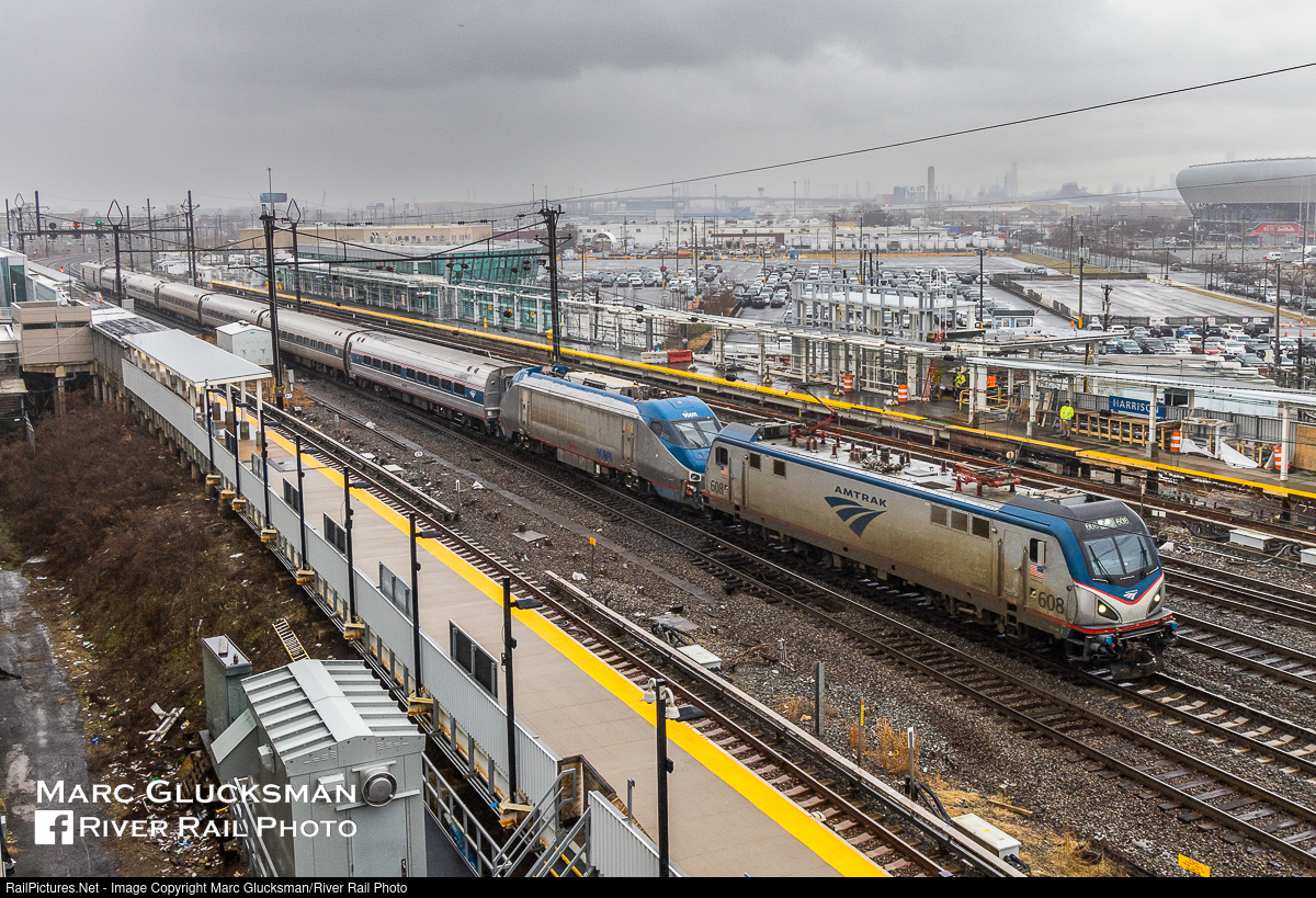 Hippo On The Move. In an unusual move, AMTK 608 (ACS-64) and 90691 (HHP-8/NPCU) were paired up on Train 43 (Pennsylvanian) out of New York Penn Station on the morning of Friday, January 13, 2023. The HHP-8 class were retired not long after the ACS-64 delivery was complete. This unit has been modified as an NPCU (Non Powered Control Unit) by Amtrak for possible future use on the railroad. The pair are seen passing through Harrison, New Jersey. The nickname "Hippo" comes from the shape of the engine as well as the HHP designation.