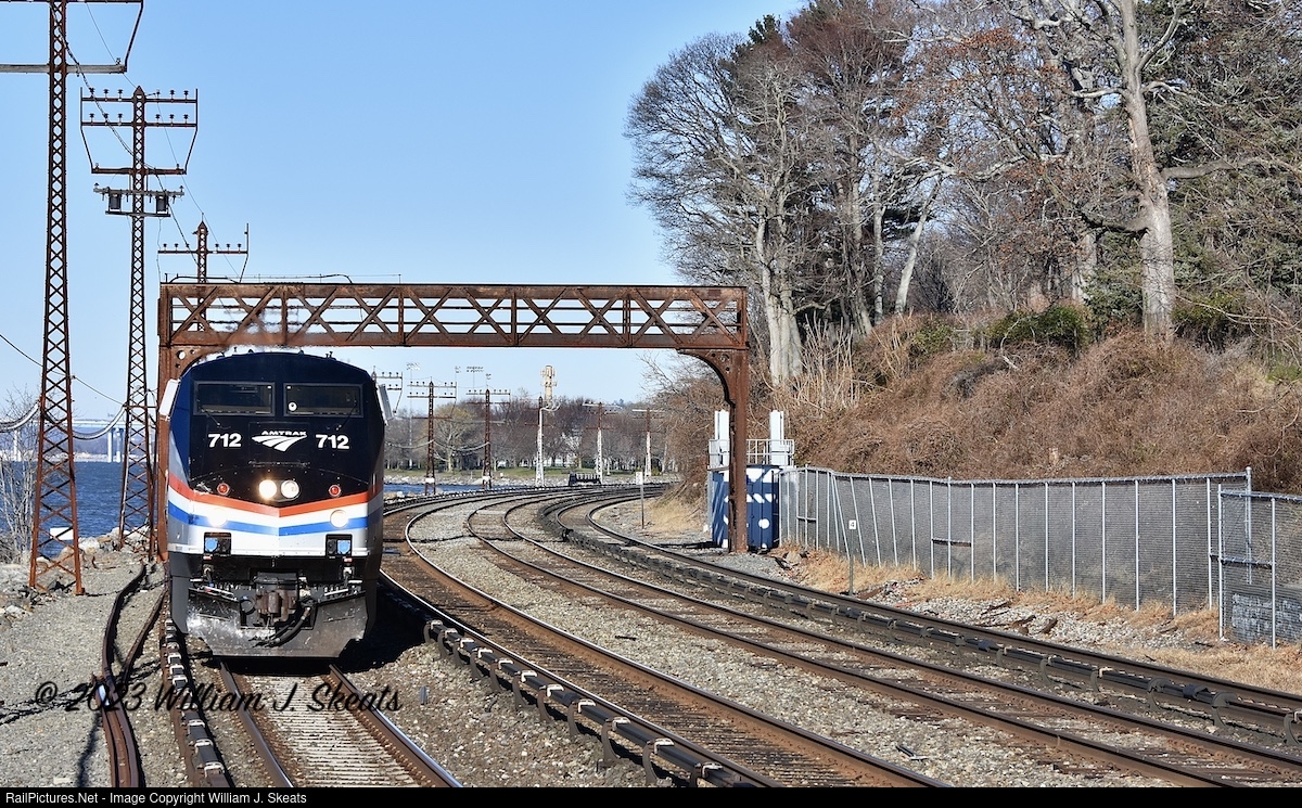 | New Empire Service train 240 was added on December 5, 2022 to the Empire Service schedule. P32AC-DM 712 and five Amfleets are heading through a former New York Central Signal Bridge in Irvington, N.Y. |