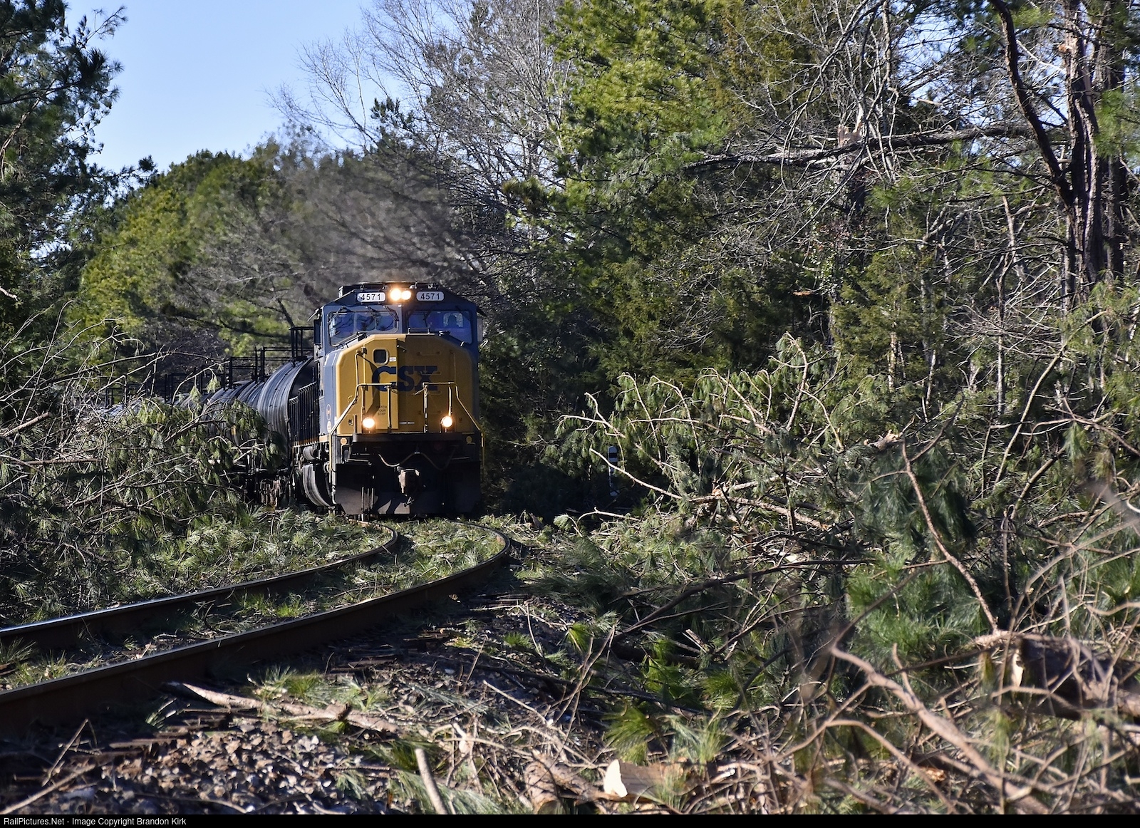 | TORNADO!!.... Thursday, January 12, storms moved across the southeastern states producing tornados causing widespread damage and loss of life. Trains were stopped on the Lineville Sub for several hours in order to remove trees and debris from the tracks in different areas. Here a MAC leads a 692 axle manifest train along with a mid DPU (CSX #578) through one of the devastated areas. |
