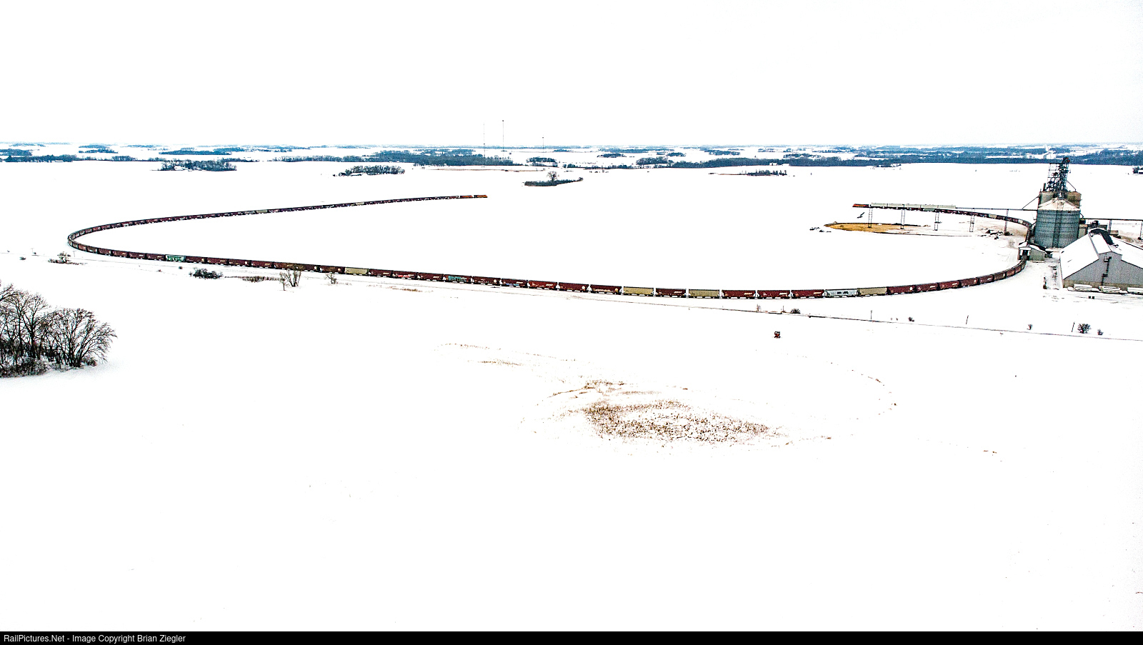 A 116 car shuttle train creeps along the United Farmer's Cooperative loop track for loading. The train would finish loading its last couple dozen cars in about two hours.