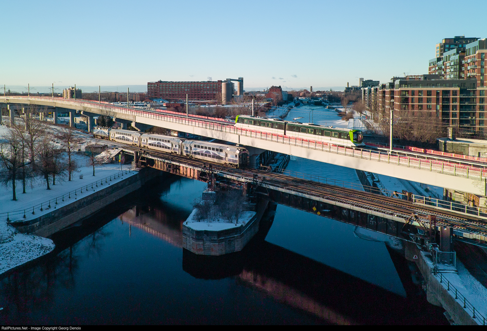 Two modes of Montreal's rail transit meet on their bridges over the Lachine Canal: A test train (Alstom Metropolis two-car set) of the yet-to-be-opened Réseau Express Métropolitain (REM) and EXO's 1204 train from Mascouche on the former lift bridge pushed by EMD F59PH no. 1345 with three Bombardier Multilevel cars.