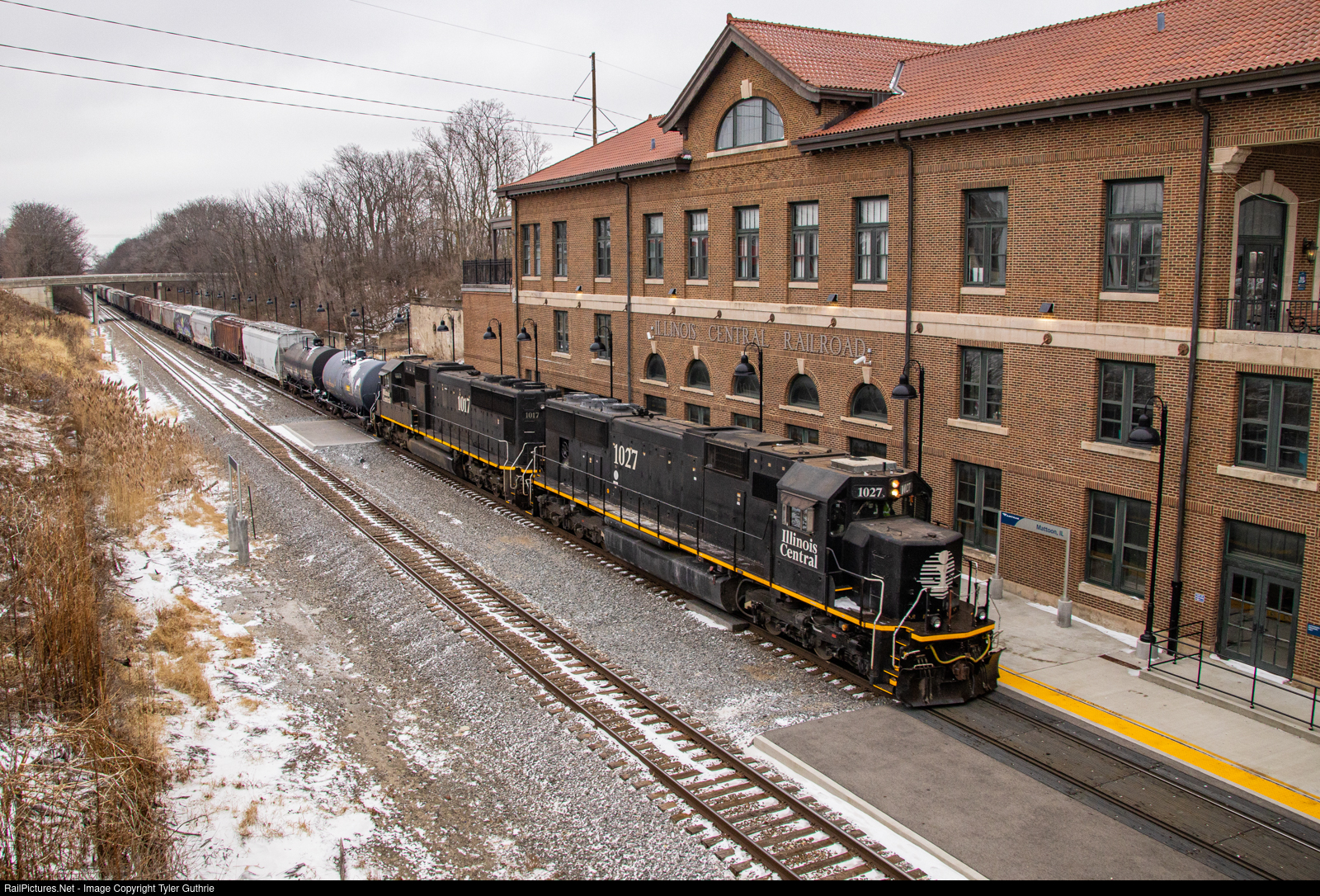 A pair of IC SD70's pass the IC passenger station at Mattoon. This 1918-built station still proudly wears IC letterings on the platform and main entrance.