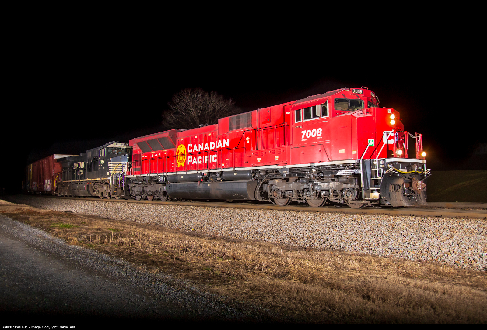 A Canadian Pacific SD70ACU leads NS 126 east through Shawsville, VA after dark.